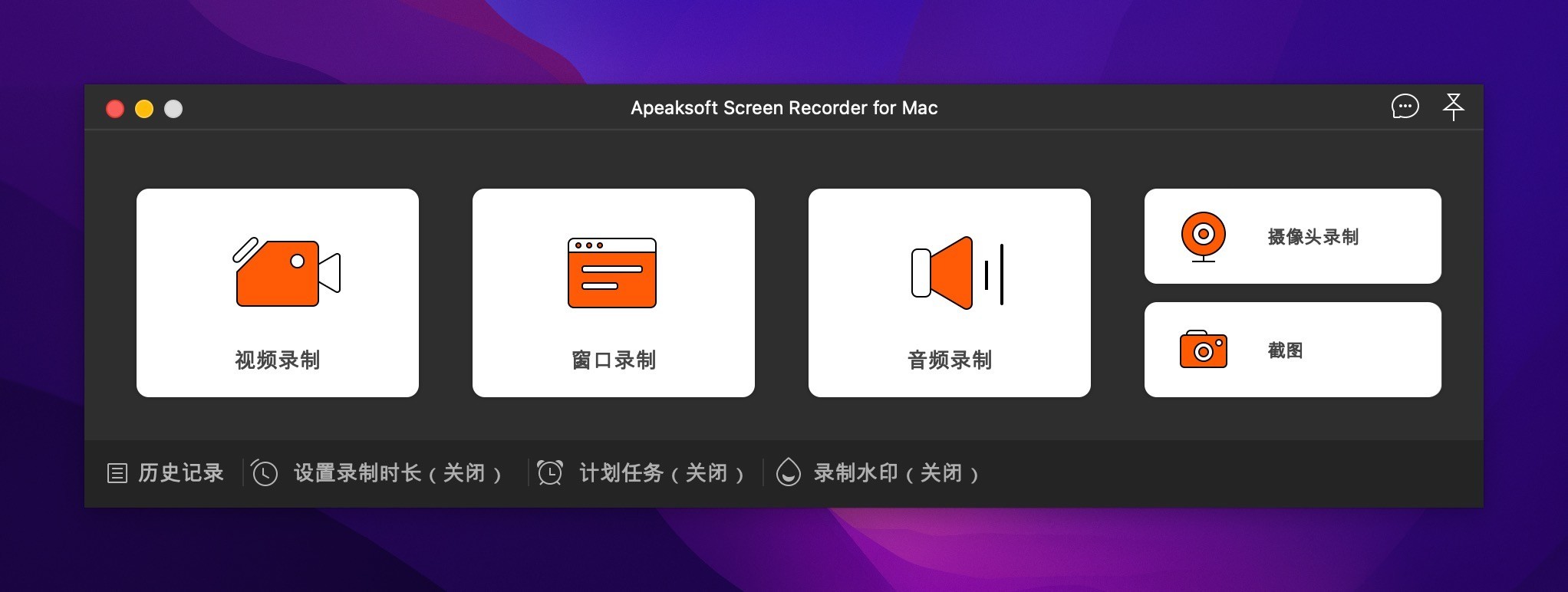 Apeaksoft Screen Recorder是一款专业的视频/音频录制和屏幕截取工具,专为你的Mac电脑设计。这是一款出色的屏幕视频录制软件,可以帮助你轻松获取在线电影和广播,录制游戏,制作视频教程,使用网络摄像头捕捉视频,进行屏幕截图等等。此外,你还可以使用文本框、箭头、高亮等工具对你的录制进行注释。