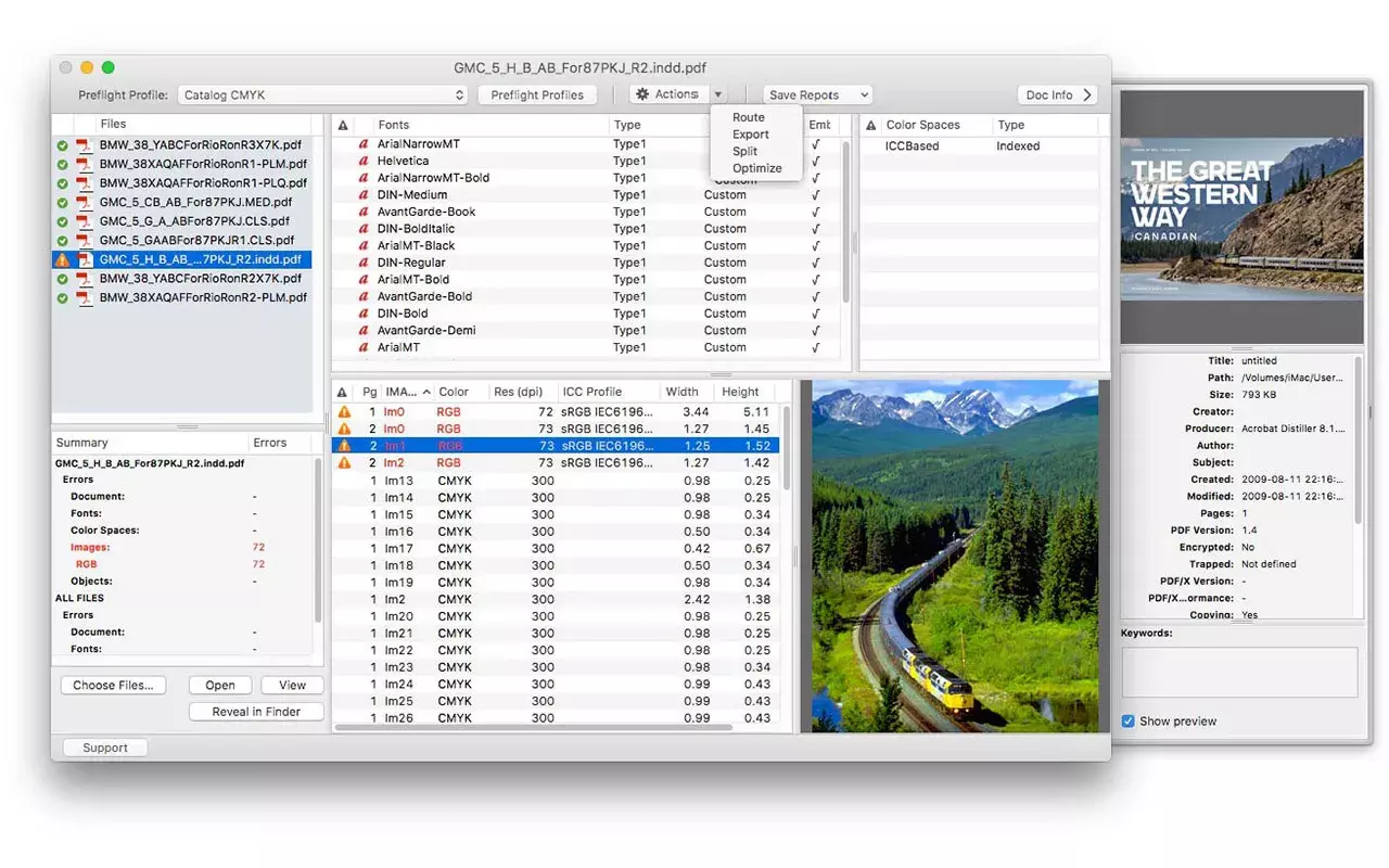 PDF Checkpoint是一款强大的批量处理软件,专门用于自动化PDF预检和转换工作。它能够快速地对PDF文件进行预检,提供关于文档字体、颜色空间、图像等属性的详细信息。此外,PDF Checkpoint支持将PDF文件批量导出为TIFF、JPEG等格式的图像,并允许用户指定所需的颜色(RGB、CMYK或灰度)、分辨率和比例。软件还可以转换PDF的颜色配置文件(例如,将RGB文件转换为CMYK),通过降低图片采样率和压缩图像来减小文件大小。PDF Checkpoint能够根据预检结果自动将PDF文件移动或复制到成功和错误的文件夹,并生成预检报告。它还能自动将多页PDF文件拆分成单页PDF文档。