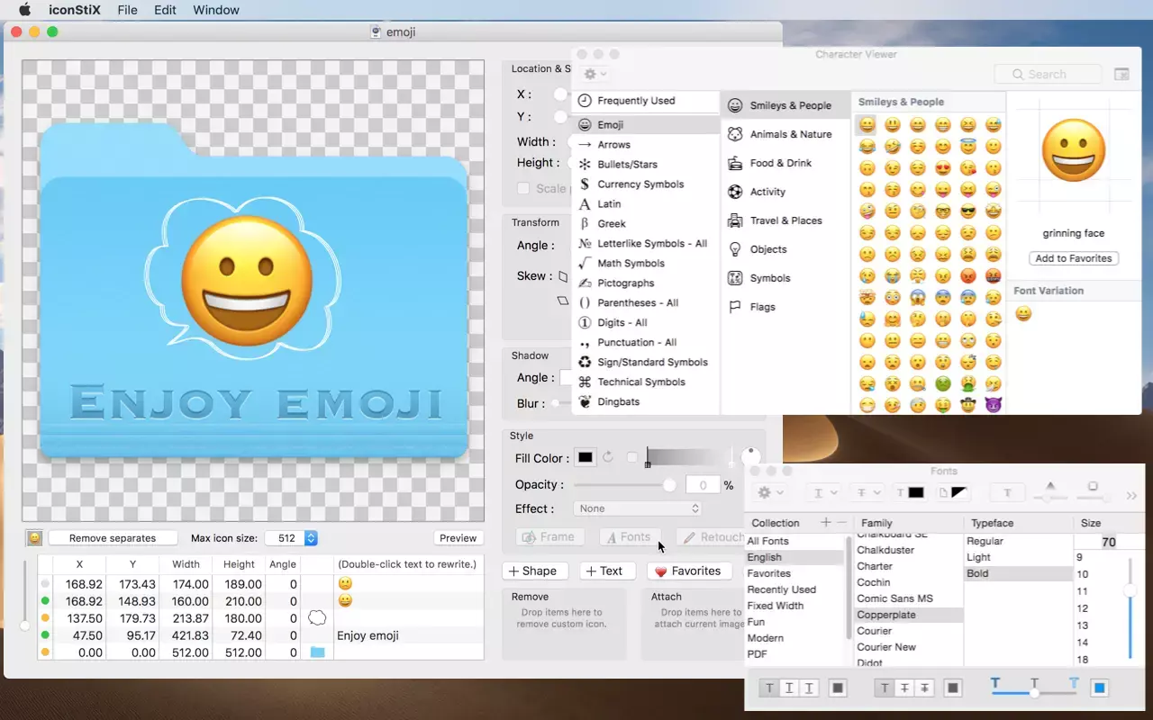 iconStiX 是一款功能丰富的自定义图标工具,允许用户将图片、形状和文本进行组合,编辑样式,并将所创作的图标直接附加到桌面项目(如文件夹)上,或保存为图片文件。该工具支持添加和重新排序多个对象,包括图像、形状和文本。用户可以自由移动、调整大小、旋转、倾斜、着色、添加阴影和效果(如凹陷、光泽、素描),修改字体并调整文本样式。iconStiX 还允许用户使用图片作为纹理(例如,用一张照片覆盖文件夹),以及使用擦除或绘画功能对图像对象进行修饰。此外,用户还可以单独添加小图标图像以在列表视图中更好地显示,限制最大图标大小(512、256 或 128),而不是使用完整大小(1024)。iconStiX 提供不同大小的预览(手动缩放或动画),允许用户保存喜爱的图片以便快速访问,并将设置保存为文档(模板)。最终作品可以导出为 icns、png、tiff 等格式的图像。通过拖放框或 Finder 服务,用户可以轻松地附加或移除自定义图标。需要注意的是,更改自定义图标需要读/写权限。