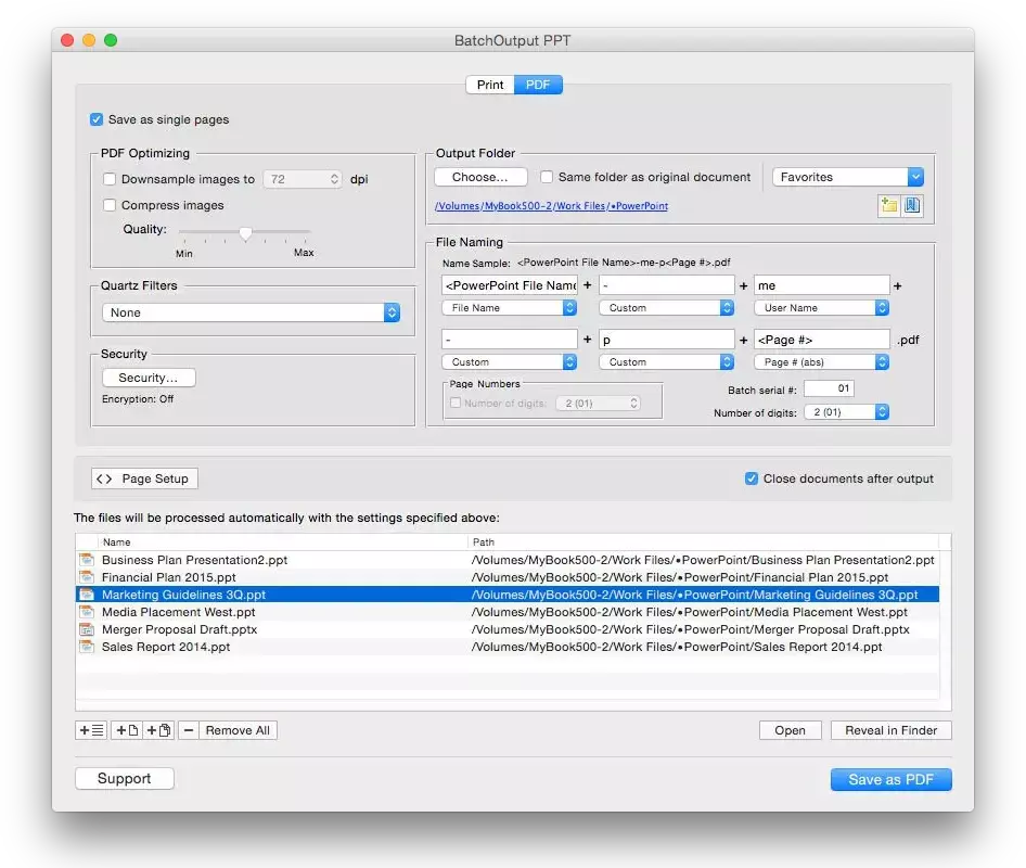 使用BatchOutput的精确控制,可以显著减小PDF大小,并优化PDF用于网页、打印和屏幕查看。您还可以应用多功能的Quartz过滤器来改变PDF的颜色调、亮度和其他质量。