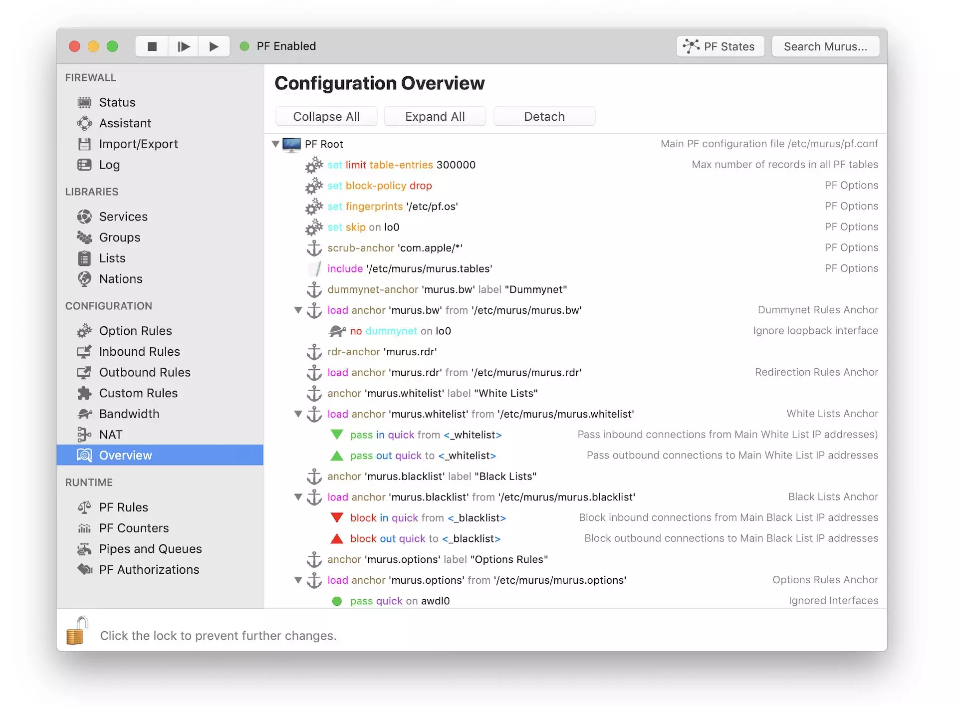 - 扩展的PF配置:Murus 2的规则集结构现在更加清晰易懂,总览代表当前pf规则集树结构,易于理解规则的存在意义和目的。