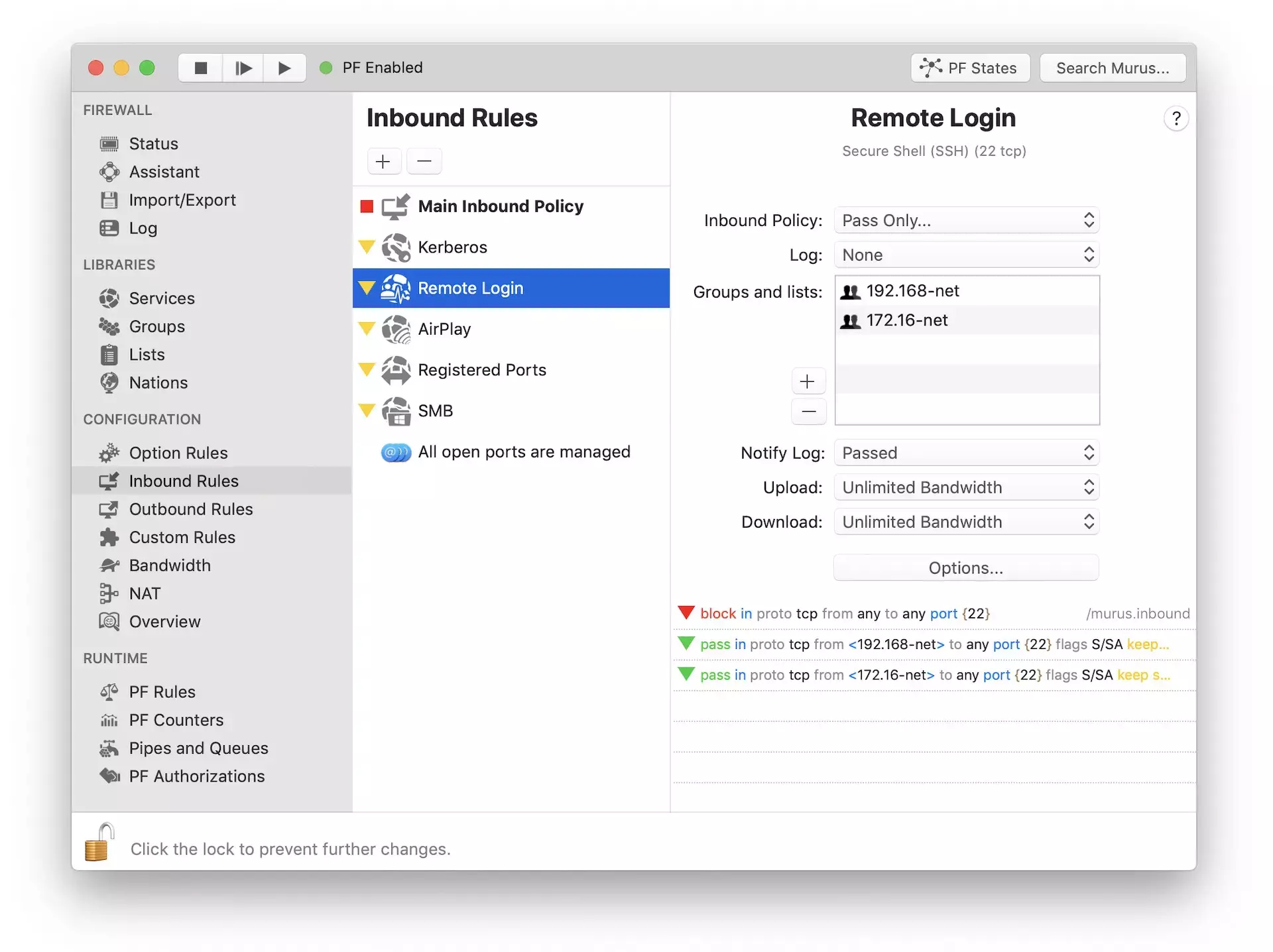 - 学习工具:不仅仅是保护Mac,Murus还是了解PF工作原理的学习工具,包括详细的文档和一个通用的macOS PF手册。