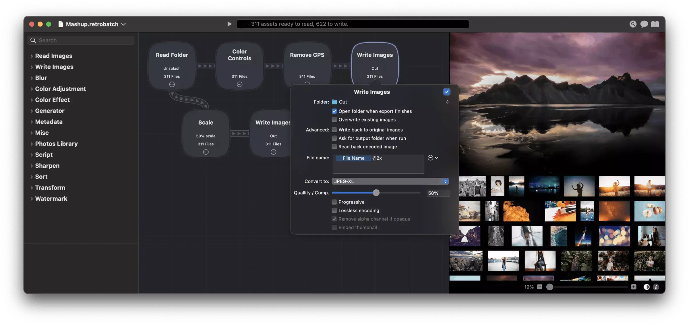 Retrobatch是一个灵活的基于节点的批量图像处理器,这意味着你可以混合、匹配和组合不同的操作,以创建完美的工作流程。