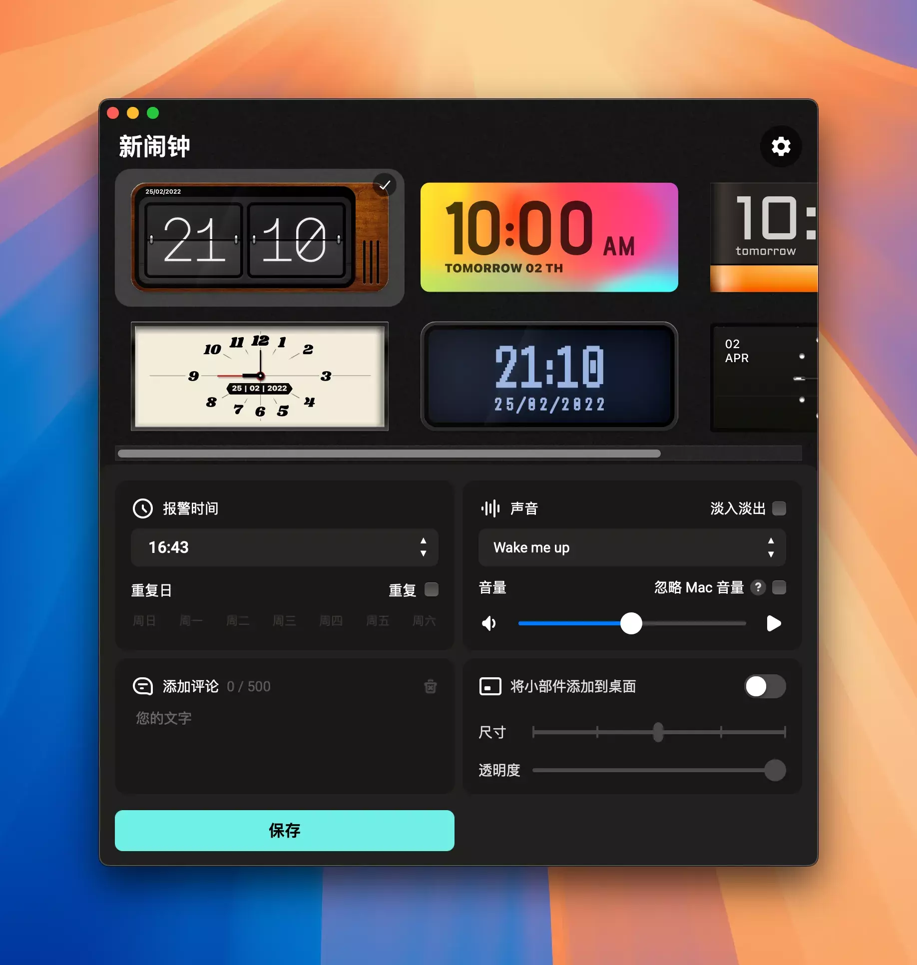 Alarm Clock是一款既实用又简洁、用户友好且设计时尚的Mac应用,旨在确保用户能在正确的时间舒适地醒来。这款闹钟的关键特性包括:可以自定义闹钟外观和选择或上传唤醒旋律,支持同时设置多个闹钟以防止贪睡,音量可调,可为整个星期设定闹钟计划,并且提供了渐强模式以实现温和唤醒。用户还可以使用小部件、设置随机闹铃声音以避免对特定声音产生依赖,防止Mac进入睡眠模式以保证闹钟响起,加入文本以将闹钟作为提醒使用,选择最适合的贪睡时间。PRO版本的特色功能包括即使忘记打开Mac的声音,闹钟依然会响起。