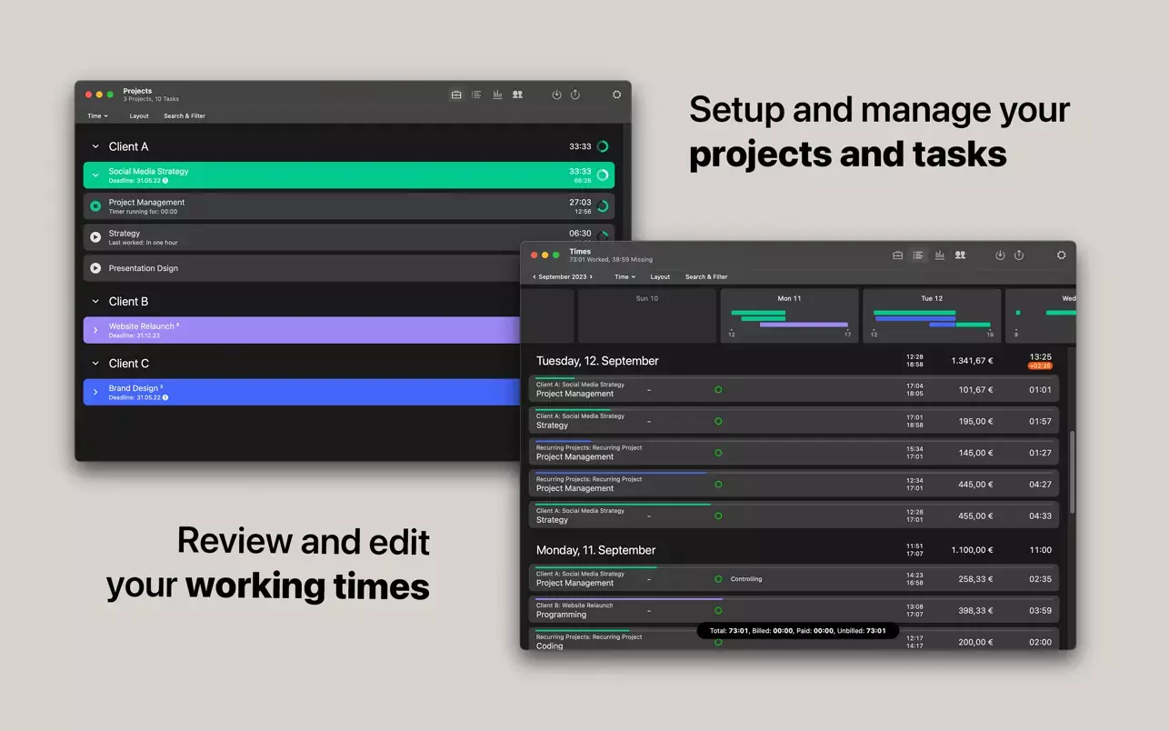 - 一目了然:设计旨在随时提供已记录时间、项目、预算和截止日期概览。未预订时间会自动显示,运行中的计时器始终可见,并通过快捷方式启动或停止。