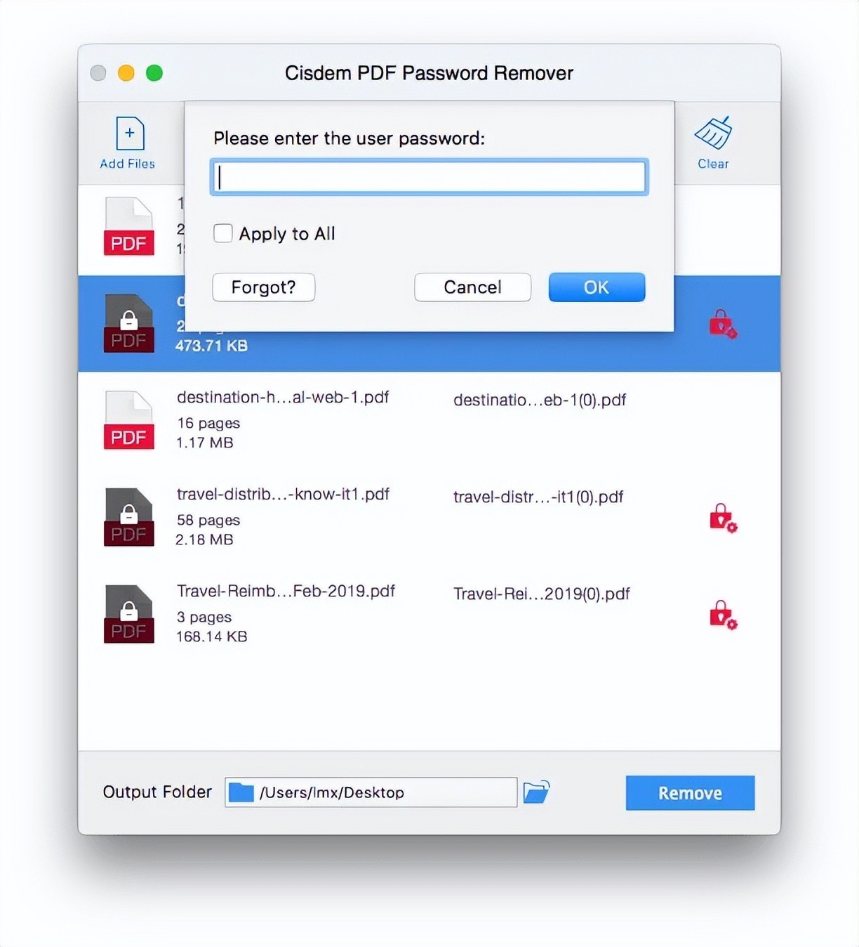 - 用户/打开密码: 针对无法打开的PDF文件,Cisdem PDF Password Remover可以解锁用户密码,使用户能够访问受保护的内容。