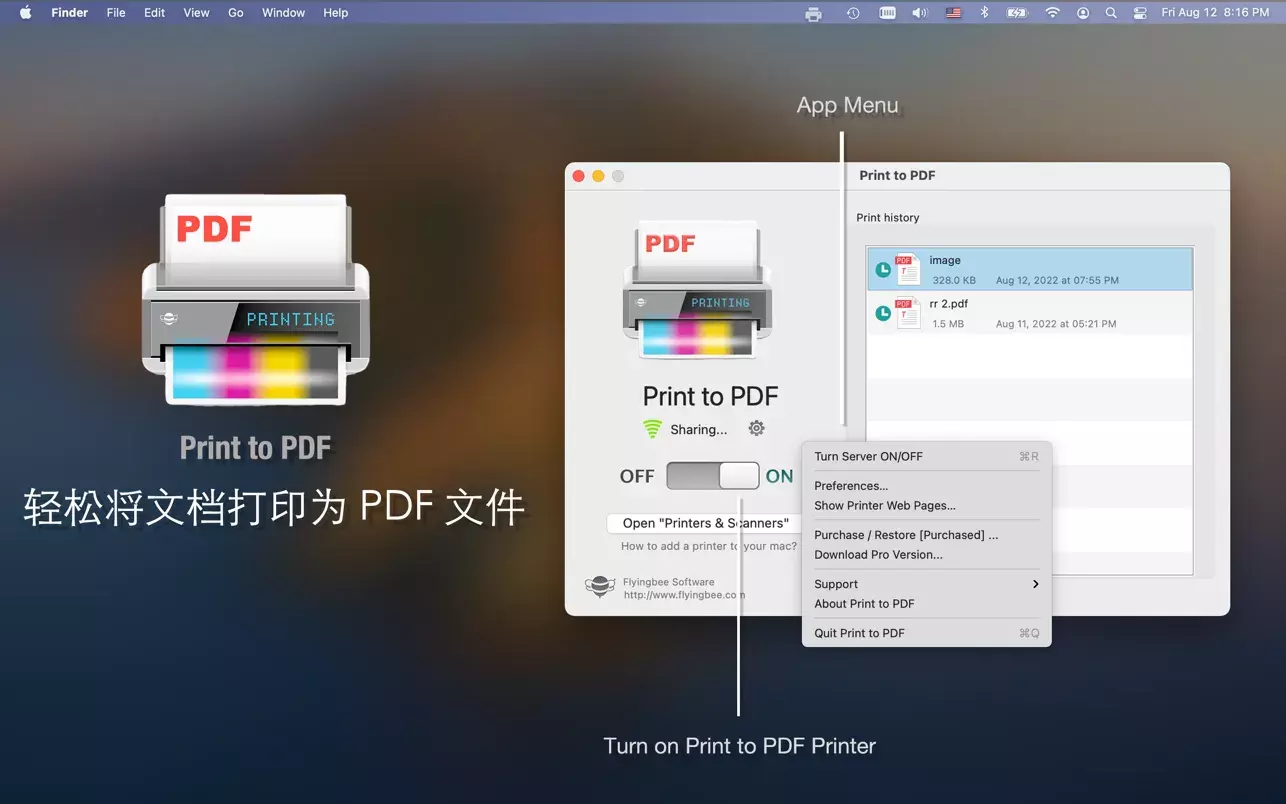 Print to PDF Flyingbee飞蜂PDF文件创建器和扫描驱动程序是一款能够将您的Mac变成小型无线打印服务器的应用程序,使您能够直接将任何文档转换成PDF格式。这个转换过程在您的Mac上本地进行,确保了100%的安全性,因为您的文件不会被发送到互联网上,也不需要互联网连接就能完成转换。此外,Print to PDF还提供了文件管理功能,能够帮助您将PDF文档按类别自动分组到不同的文件夹中,方便管理。无论是电子邮件附件、iWork和MS Office文档、网页、照片还是Dropbox、Google Drive等在线存储服务上的文件,使用Print to PDF都能轻松打印成PDF文件。