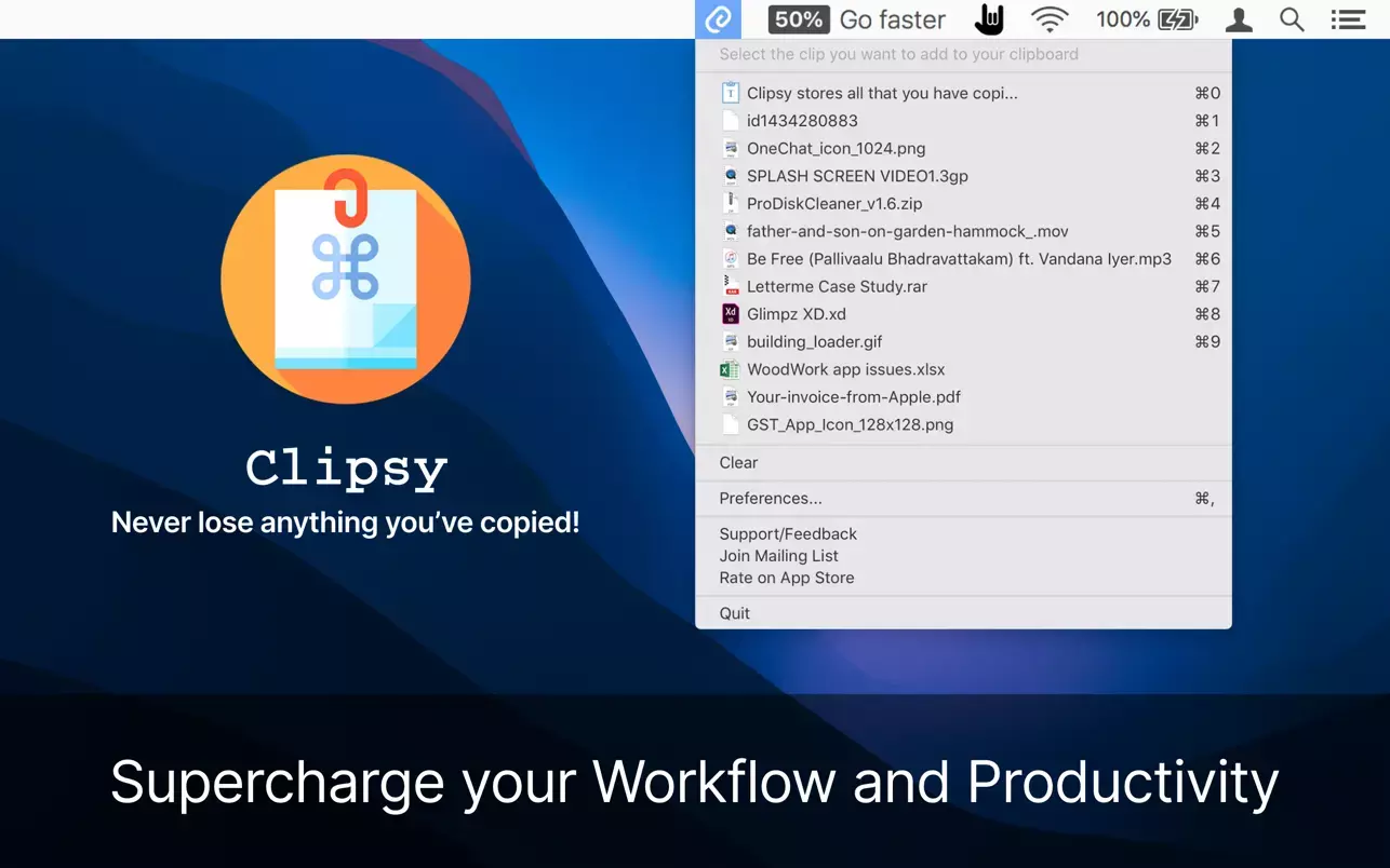 Clipsy Mac 是一款强大的剪贴板管理工具,旨在提升您的工作效率,帮助您在短时间内增加生产力。使用Clipsy,您将再也不会丢失之前复制的文本和文件,并且能够管理多达9999条复制历史记录。