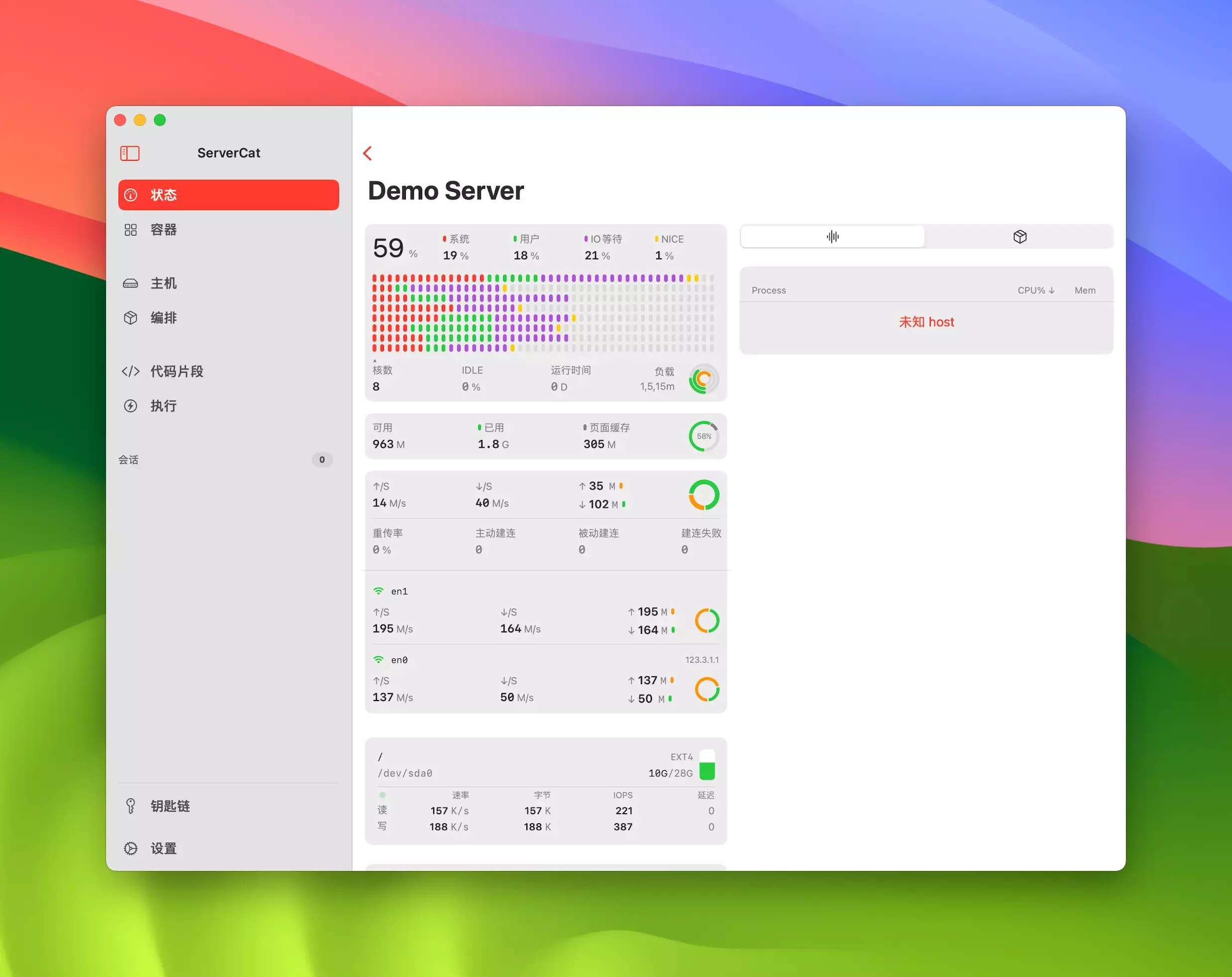 ServerCat是一款基于SSH的监控和运维自动化工具套件,让您能够随时随地管理服务器和运行中的服务。只需一个SSH账户,无需安装任何第三方应用程序,即可监控服务器的运行状态。它支持创建命令片段或使用即时命令,实现一键批量运行脚本。ServerCat还特别支持当前最流行的容器工具Docker。通过SSH,ServerCat提供了一系列监控和运维自动化工具,帮助您随时随地管理服务器及其运行的服务。只需要一个SSH账号,ServerCat就可以监控您的服务器运行状态,无需安装任何第三方应用。您可以创建命令片段或使用即时命令一键在服务器上批量运行脚本。我们也为当前最流行的容器工具Docker提供了特别支持。ServerCat免费提供以下功能:支持iOS/iPadOS/macOS,管理SSH密钥,查看服务器每个CPU核心的占用情况,查看GPU核心使用情况以检查机器学习状态,查看内存使用情况,查看网络流量和速率以及每个网卡的流量状态,查看每个磁盘实时的读写状态,查看Docker容器的状态和数据。解锁高级版后,您将享受以下功能:SSH终端,多种终端配色方案,在所有服务器上批量运行命令,管理命令片段并一键在服务器上运行,在所有设备间安全同步数据(使用您的私人iCloud空间同步,数据不会上传到任何第三方服务器),创建和管理容器,使用TouchID/FaceID保护内容安全。