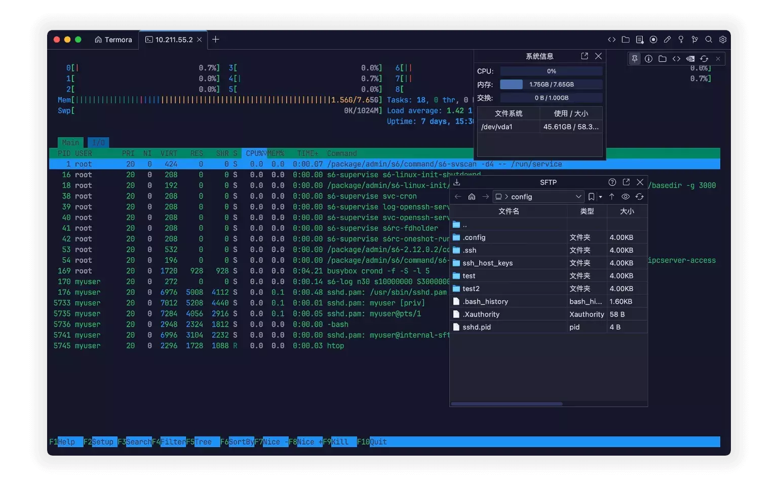 Termora 是一款跨平台的终端模拟器和 SSH 客户端,兼容 Windows、macOS 和 Linux,未来还计划扩展到 Android、iOS 和 iPadOS。该应用采用 Kotlin/JVM 开发,支持 XTerm 控制序列协议,并集成了多项实用功能,包括内建密钥管理器、X11 转发、SSH-Agent、系统信息展示和图形化 SFTP 文件管理等。用户可以通过快捷指令进行文件传输,支持同时进行多个任务,并具备文件编辑、权限管理及快速删除功能。Termora 还提供插件支持,允许用户连接各种云存储服务和文件共享协议,极大提升了终端操作的便捷性与灵活性。