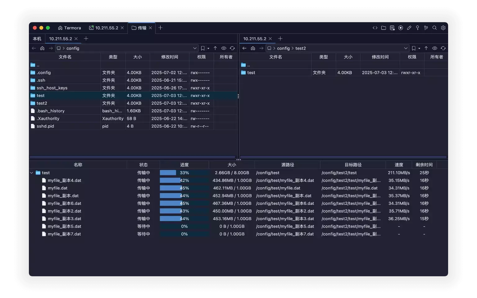 - 文件传输: 支持在 A ↔ B 服务器之间直接传输文件,具有文件夹递归复制功能,最多可同时运行 6 个传输任务。