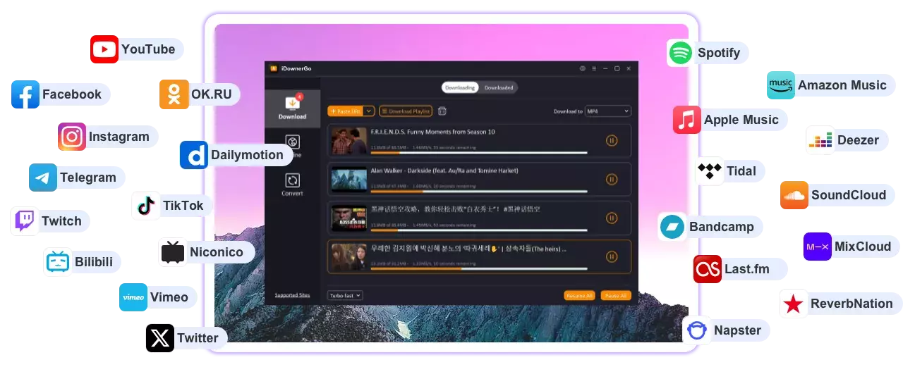 iDownerGo 是一款全能型视频音乐下载工具,支持从10,000+网站获取8K超高清视频和高质量音频,提供极速下载与格式转换的一站式解决方案。