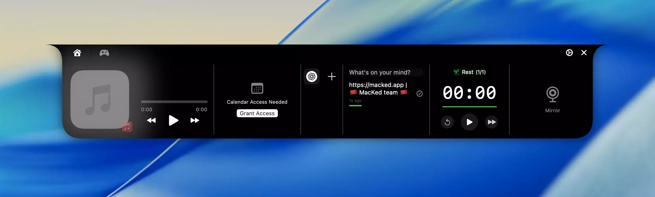 - 音乐控制: 用户可以直接从缺口控制Spotify和Apple Music应用,轻松播放、暂停、跳过歌曲以及查看当前正在播放的内容,而无需切换窗口,保持专注。