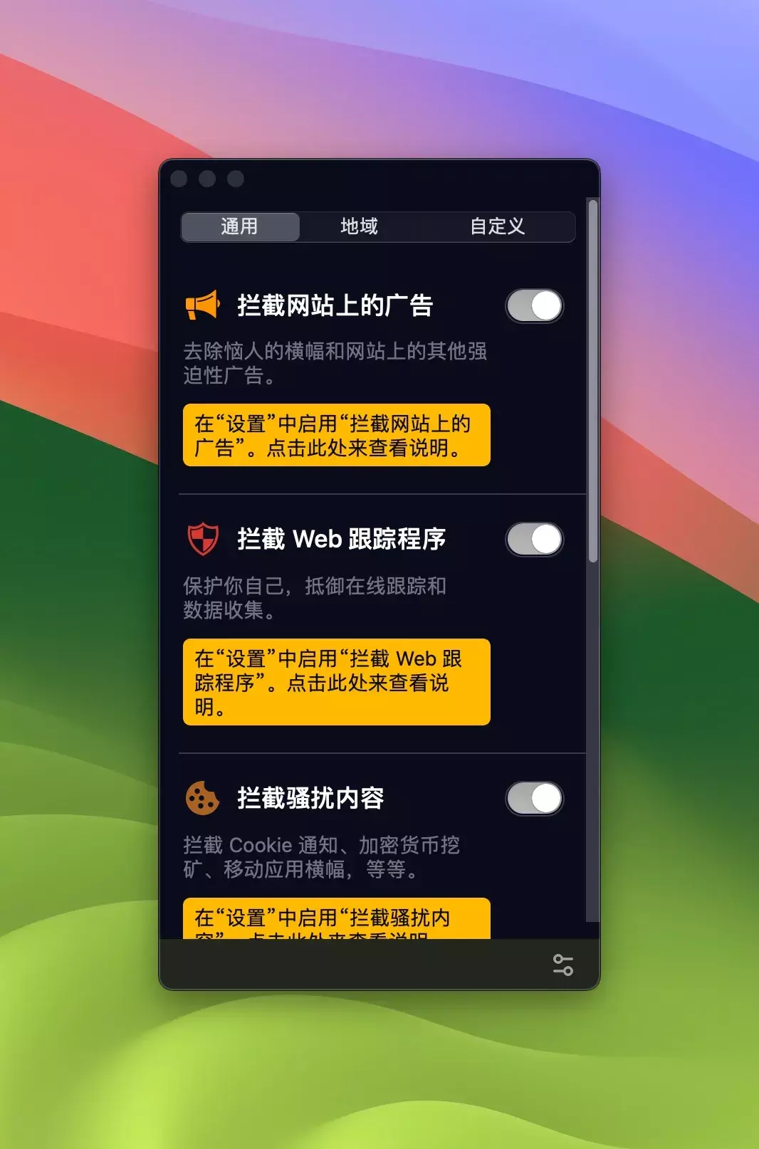 - 免费提供的功能:启用一个类别的能力(例如,仅阻止追踪器)从Safari扩展直接将网站列入白名单通过iCloud在设备间同步白名单查看网站上被阻止资源的可能性