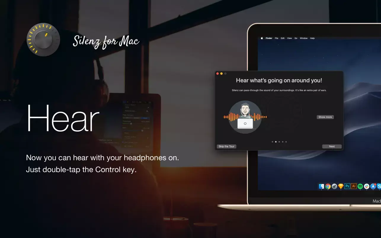 - 声音调整: Silenz能够捕捉周围的声音,并与您的需求相匹配——无论是静音音乐,还是将外部声音与之结合。您无需摘下耳机或暂停音乐,即可始终专注于工作。