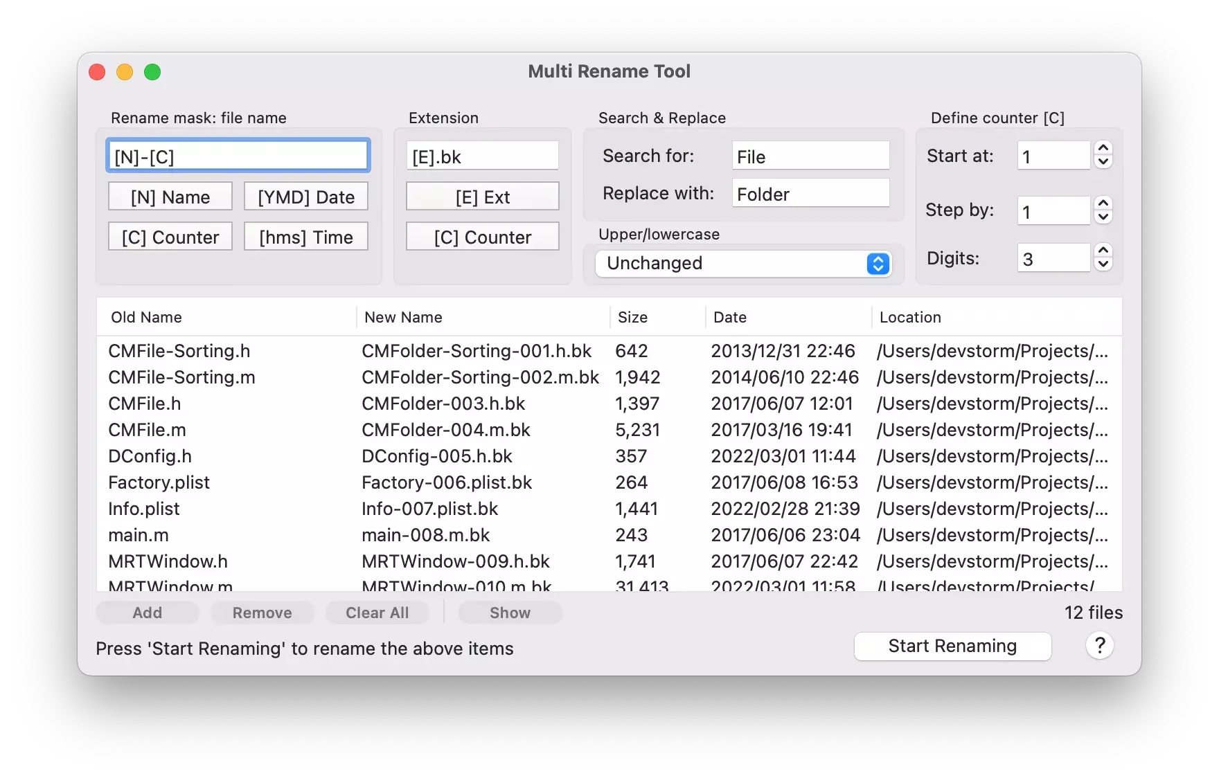 Multi Rename Tool 是一款专为 macOS 设计的批量重命名文件工具,可以帮助用户在短时间内轻松地重命名成千上万的文件,从而节省时间和精力。通过 Multi Rename Tool,用户可以几乎瞬间重命名 1000 个文件,添加计数器、日期、前缀、后缀,甚至替换特定字符,仅需几次点击,就能完成繁琐的重命名工作。