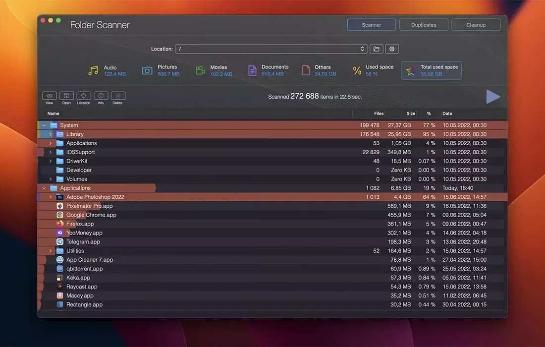 - 文件夹扫描器: 可视化的文件夹扫描器帮助用户识别磁盘上大的文件和文件夹,提供有序的磁盘空间使用情况分析,快速定位占用空间的文件夹。