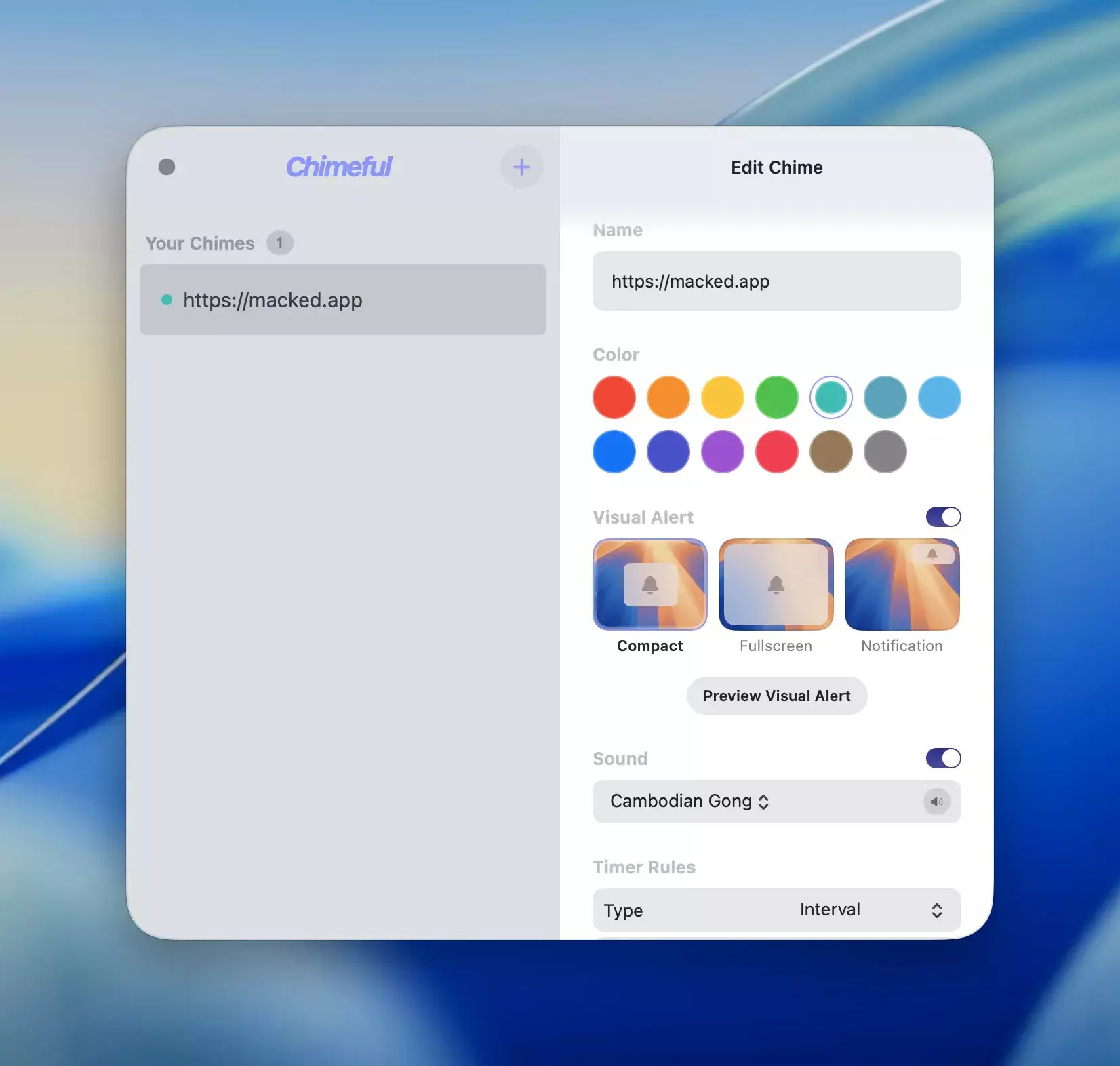 - 无干扰的体验: Chimeful 设计旨在无缝集成到 macOS 中,保持低调,仅在必要时打扰用户,帮助用户避免疲劳并保持清晰的优先事项。