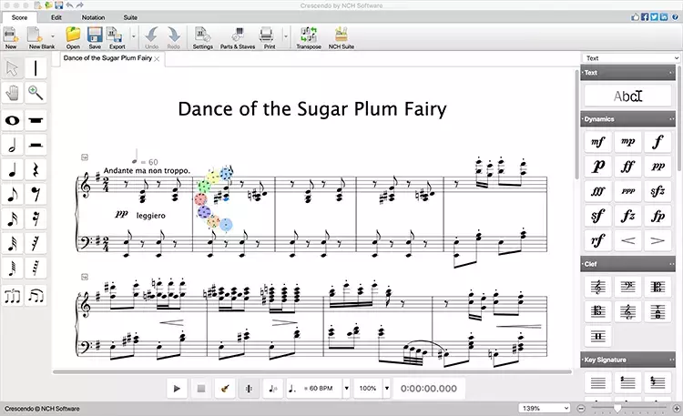 - 音符编辑: 用户能够轻松添加升降音、连音、音符和更多符号,使乐谱表达更为丰富。