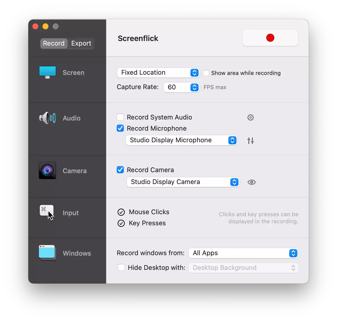 - 高帧率高质量录制: Screenflick 可以以高达60 fps 的速度录制整个屏幕,确保动画的流畅与清晰,同时支持5K分辨率录制。