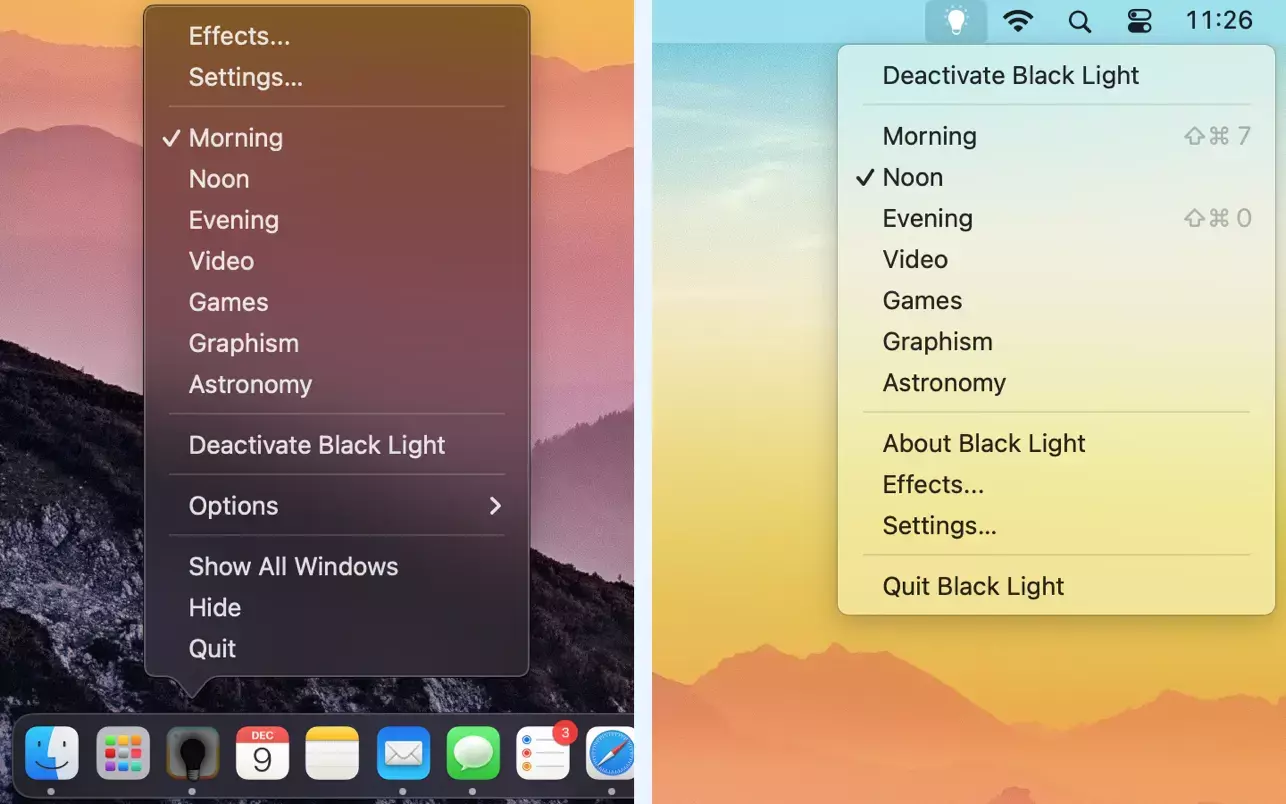 - 菜单管理: 用户可以从 dock 菜单中查看可用效果,并能够轻松激活或停用。