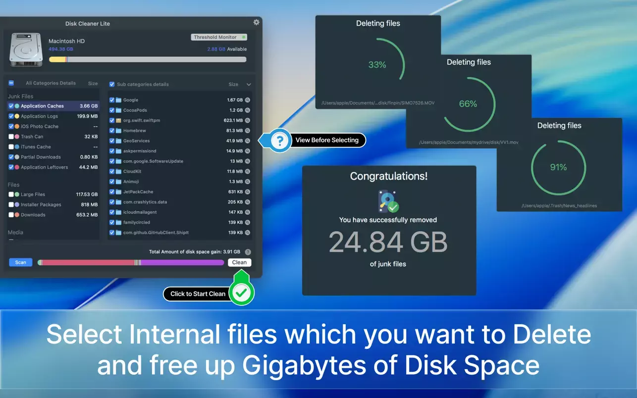 Disk Clean 是一款旨在释放 Mac 硬盘空间的应用程序,能够通过删除大量不必要的文件来帮助用户腾出更多存储空间。Disk Clean 可以自动扫描和清理占用硬盘空间的垃圾文件,确保用户的设备始终保持优化状态。