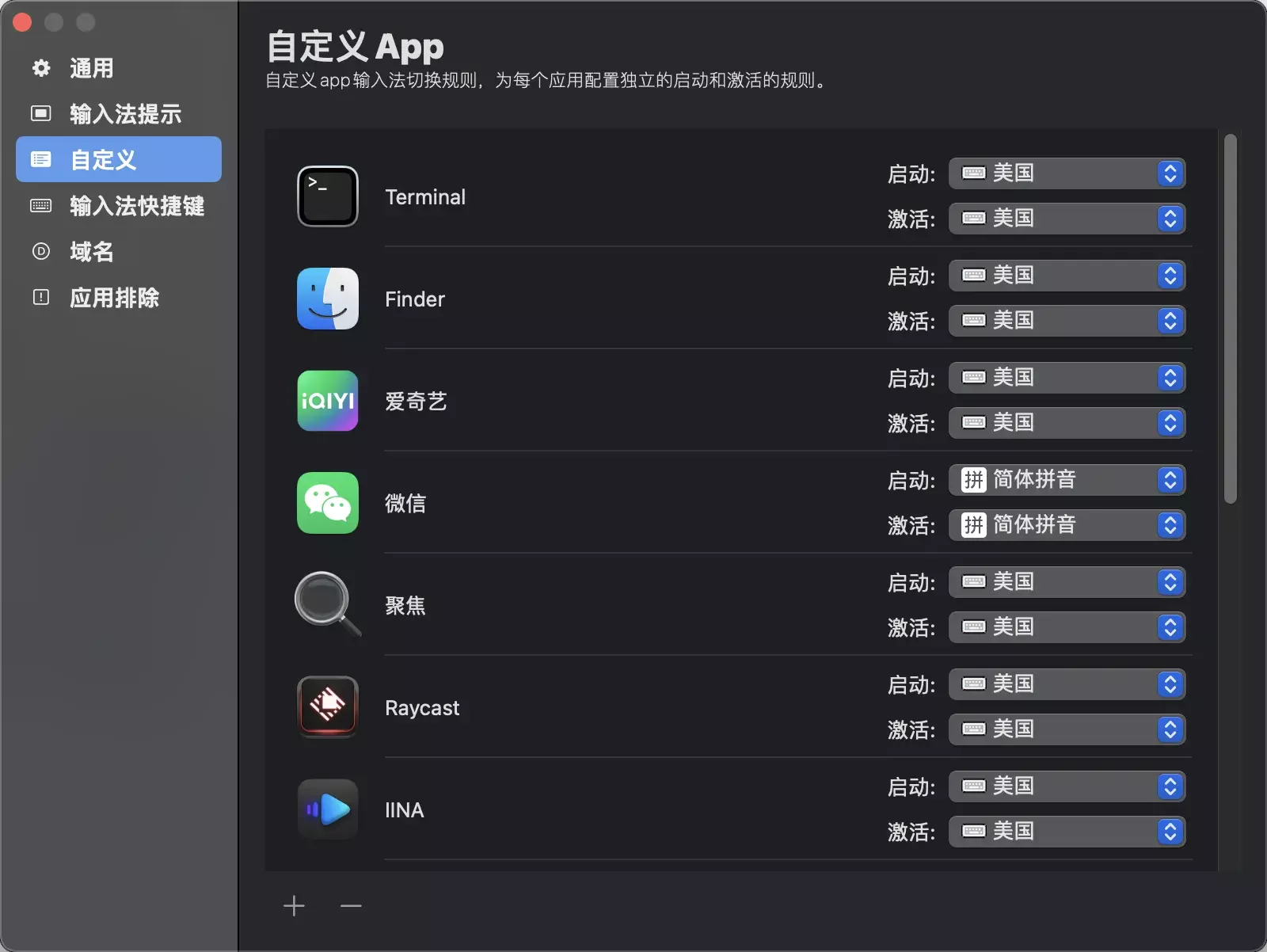 - 应用自定义: 用户可以为不同应用设置默认输入法,无论是首次启动还是从后台切换到前台时,均可自动切换。