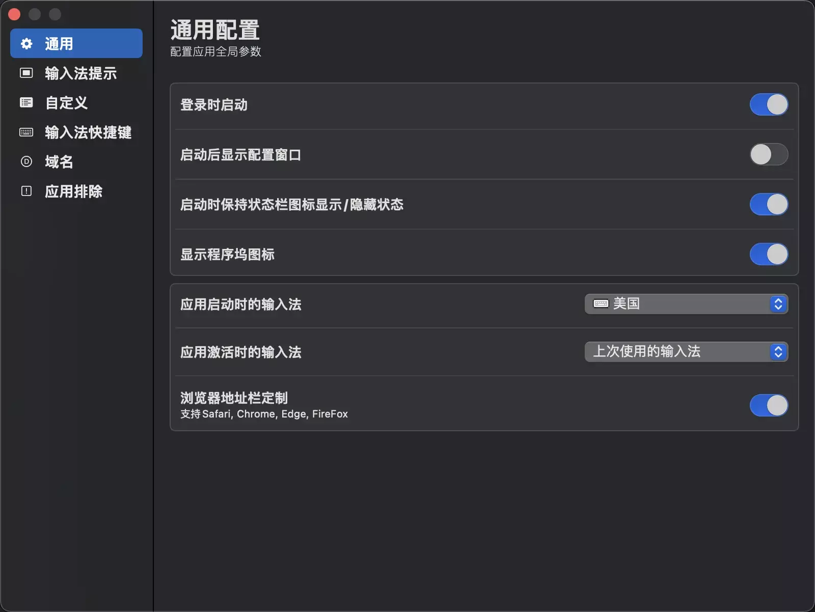 - 个性化配置: 用户可以根据需求配置个性化的输入法切换方案,包括浏览器地址栏的输入法及基于域名匹配的设置。