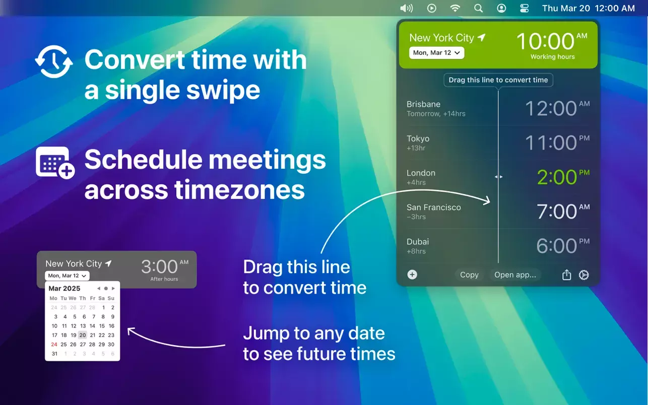 - 日常使用的时间转换器: 迅速转换世界各地的时间,计划旅行或检查航班到达时间。在不同国家的同事之间选择良好的会议时间,只需拖动光标即可轻松完成。