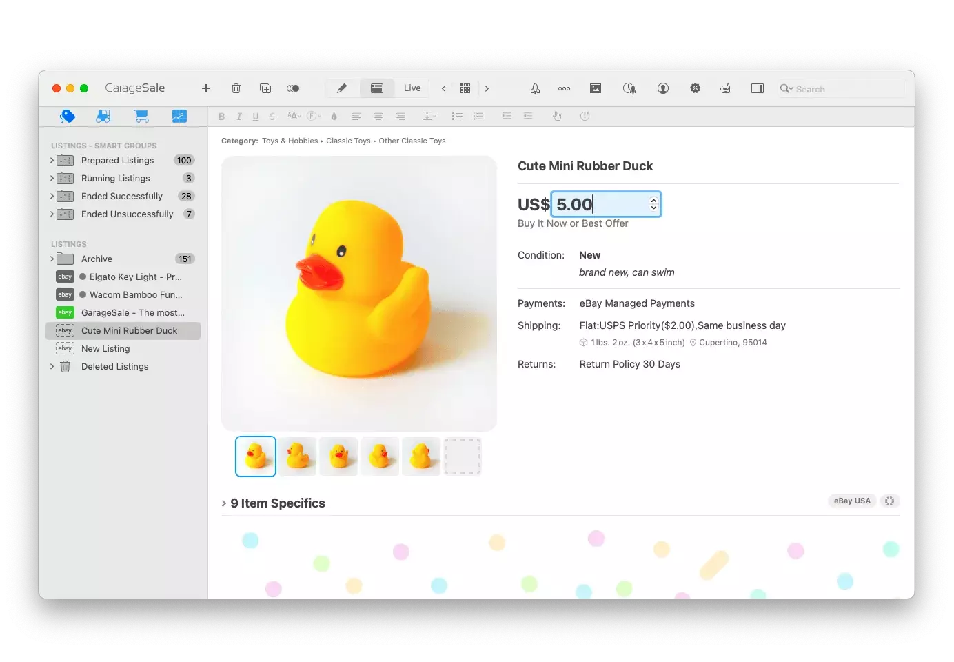 GarageSale是一款专为macOS用户设计的工具,它极大地简化了在EBay上发布和管理拍卖的过程。对于那些认真从事EBay贸易的人来说,这个应用程序提供了一系列实用功能和对必要信息的快速访问,使得任何不便都显得微不足道,因而非常受欢迎。通过GarageSale,用户可以轻松访问EBay的所有关键功能,无需经历繁琐的网站操作流程就能开启拍卖。应用的亮点包括:允许用户同步手机摄像头拍摄商品照片并一键上传;提供超过130种页面模板,使拍卖页面吸引眼球;支持保存并重用商品模板,方便在商品未售出时重新上架;设有定时器功能,用户可以设定拍卖的开始时间;以及支持多账户管理,让用户能够轻松切换和管理其在EBay上的所有账户。