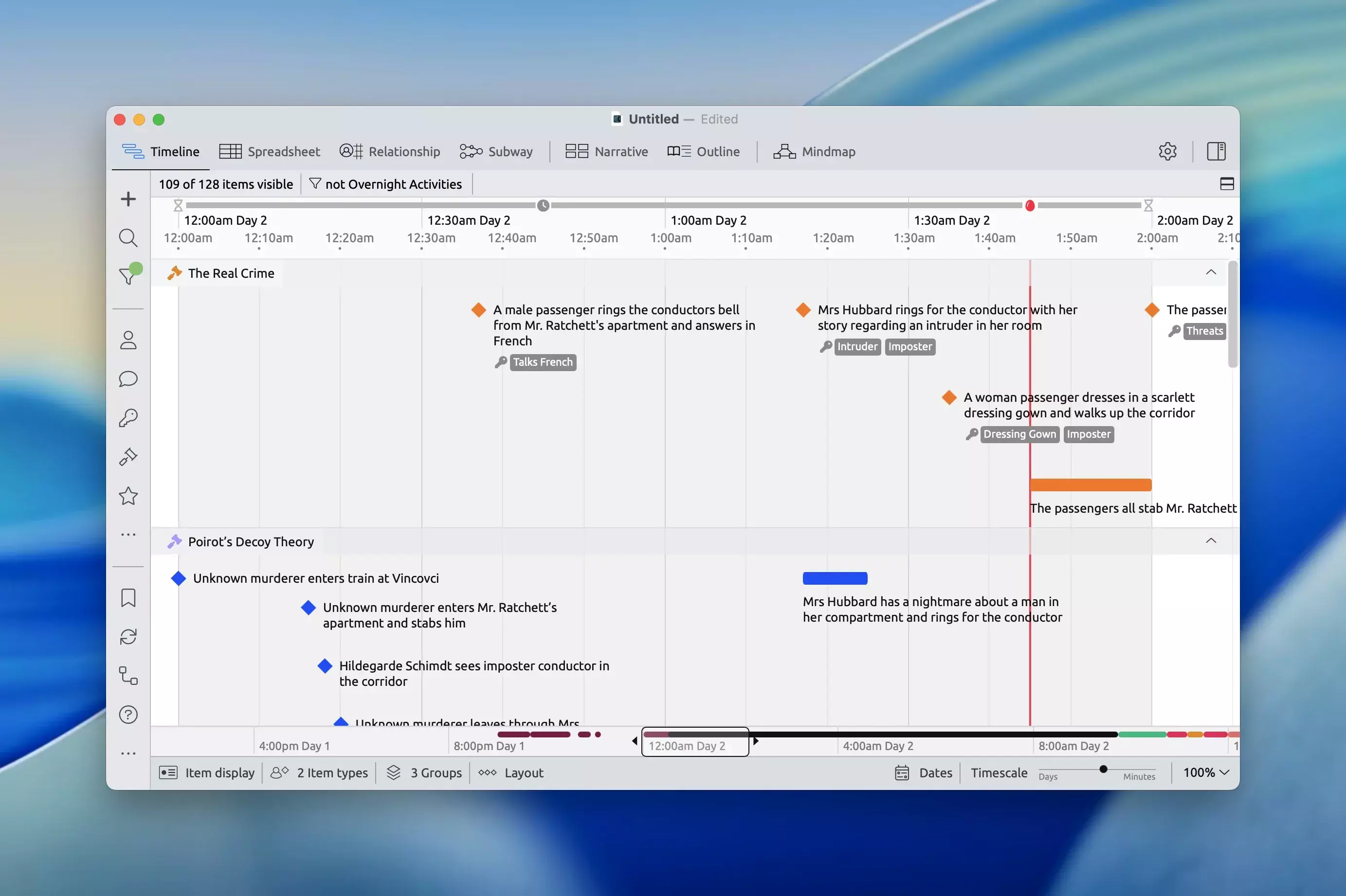 - 整体规划能力: 用户可以按时间、叙述或角色发展来可视化故事,协调子情节,扩展创意,跟踪依赖关系。