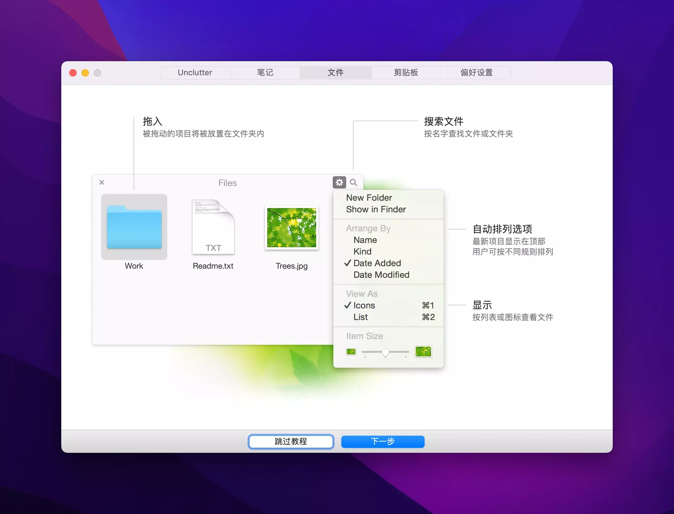Unclutter是一款功能强大而practical的macOS应用程序,它能帮助用户更高效地对桌面,剪贴板以及笔记进行管理。借助这款软件,用户能够快速地使用常用文件和编辑文本,并且可以保存笔记以及访问过去的剪贴板内容,从而大大提升工作效率。需要复制几件事情,然后能够多次粘贴每一条吗?总是忘记一些东西?那么怎么样找一款应用程序,不仅能让你在剪贴板上存储数十个项目,还能创建和存储笔记呢?试试使用Unclutter,这是一款强大的桌面便签应用程序,也是一个优秀的拖放文件管理器。它提供一套在一个方便的窗口中完美统一的实用工具。