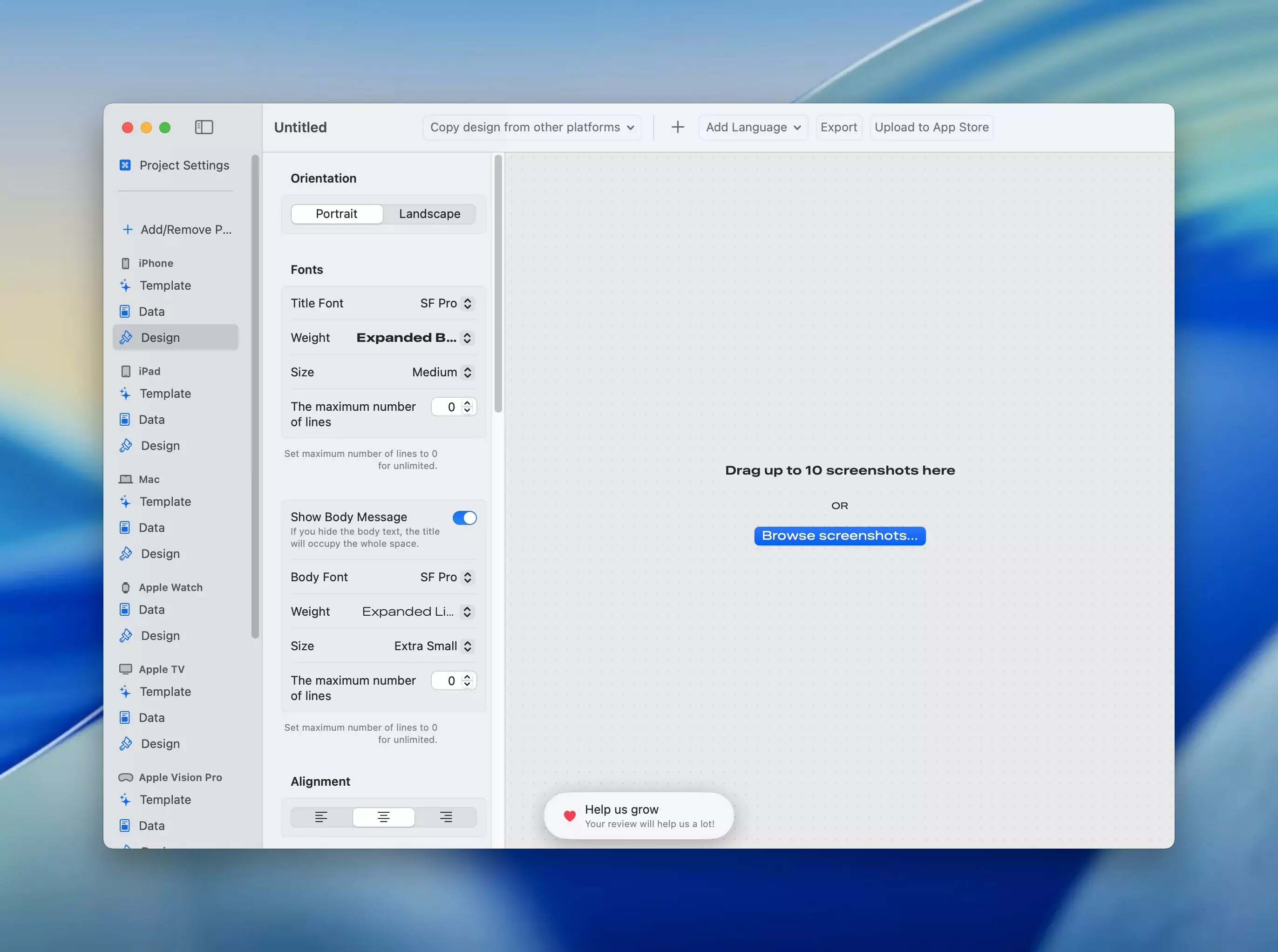 Screenshot Studio是一款为应用开发者提供的工具,旨在快速简便地创建App Store和Google Play Store所需的截图。该软件具有易于使用的界面,用户可以从多种自定义选项中选择所需样式,对字体、文本大小、颜色、对齐方式、设备位置和设备框架进行调整。用户也可以选择预先定义的模板,完全无需设计技能。Screenshot Studio支持文本的AI翻译以及手动翻译功能,方便进行本地化处理。用户可以一键导出所需的所有截图,并直接上传到App Store,同时支持将项目保存以便后续编辑。该软件兼容横向和纵向展示,并支持多种平台,包括iPhone、iPad、Mac、Apple Watch、Apple TV、Apple Vision Pro和Android手机,确保开发者轻松创建突出功能的精彩截图。