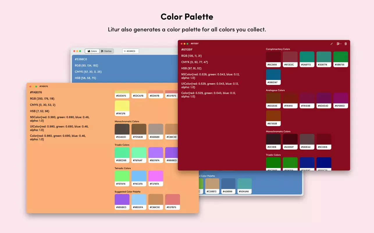 - 生成的颜色调色板: 对于每个收集的颜色,Litur 会生成与之协调的调色板,帮助提升设计感。