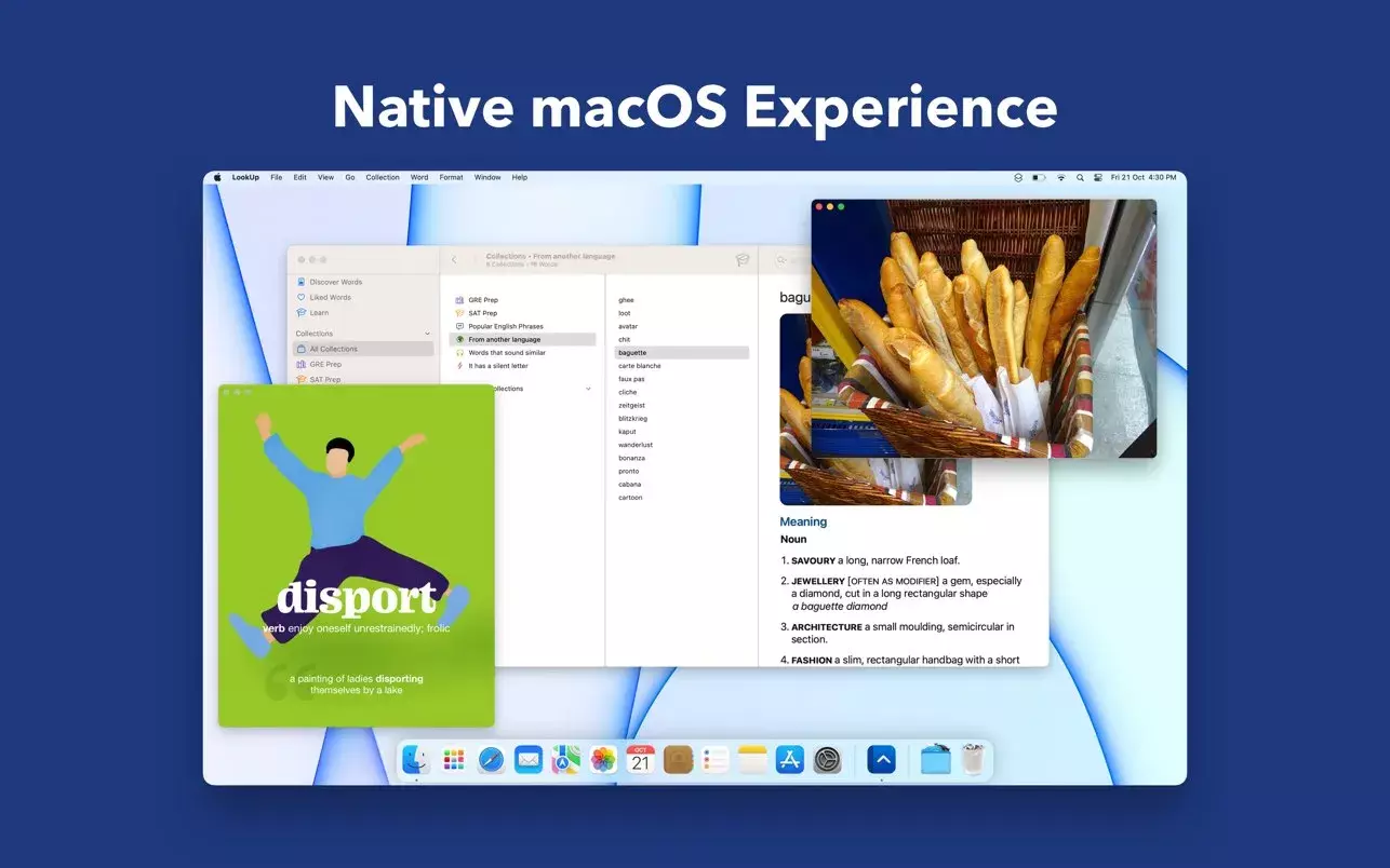 - 完整的词典和同义词典: LookUp 提供由牛津英语词典支持的全面英语词典,内含音频发音、例句、用法说明和图片,帮助用户更好理解单词。