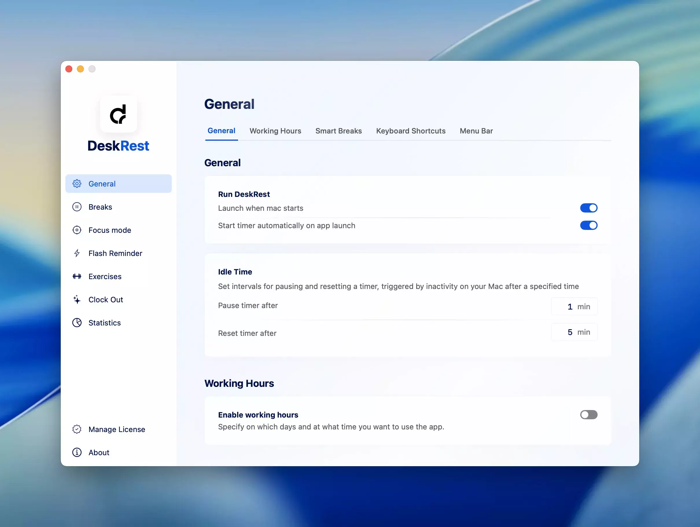 - 工作时间智能管理: 用户设置的工作计划会影响 DeskRest 的提醒功能,软件只在用户的工作时间内激活,避免干扰用户的私人时间。