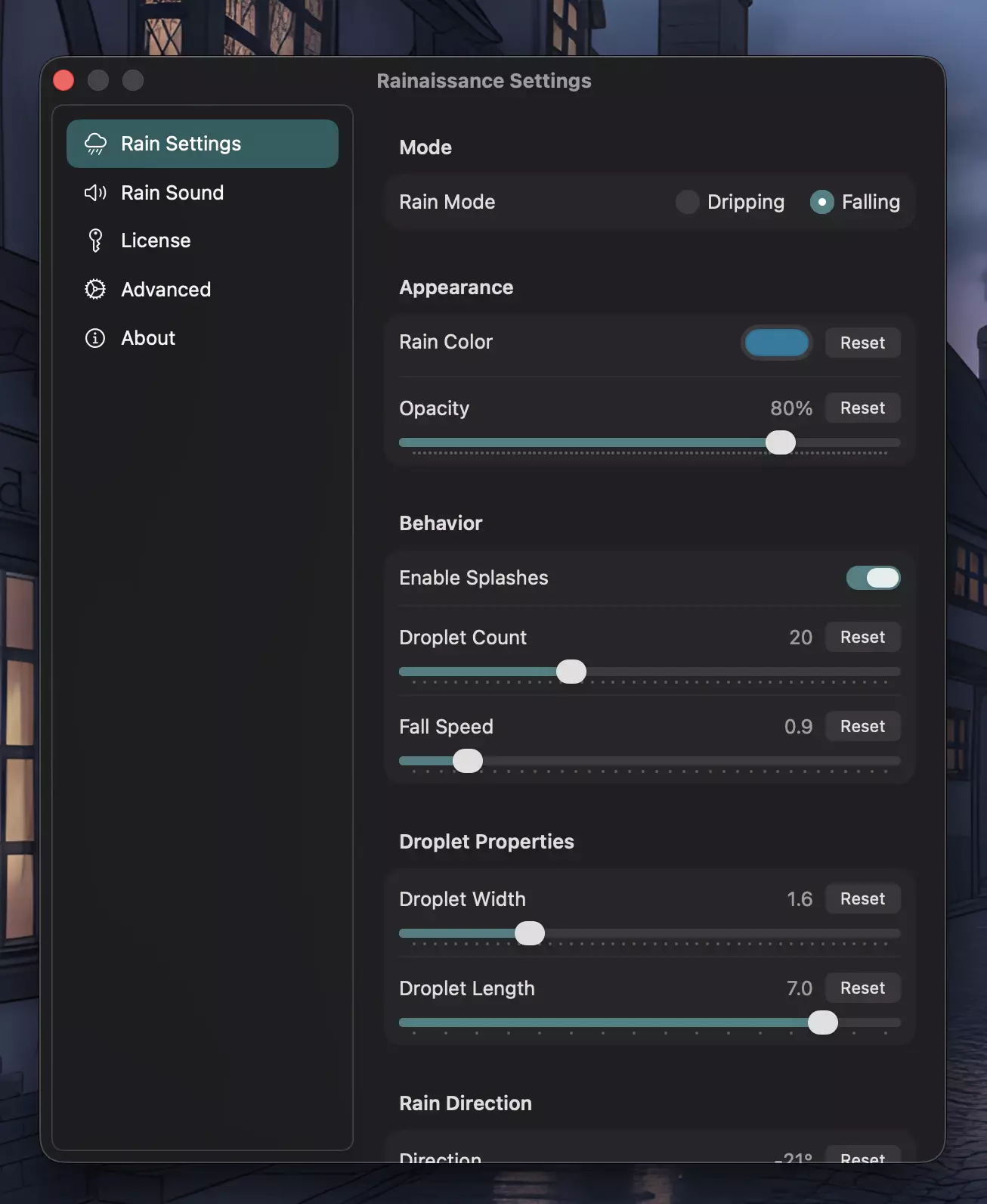 - 全面自定义: Rainaissance 提供各种设置选项,允许用户定制雨的表现,创造个性化体验。