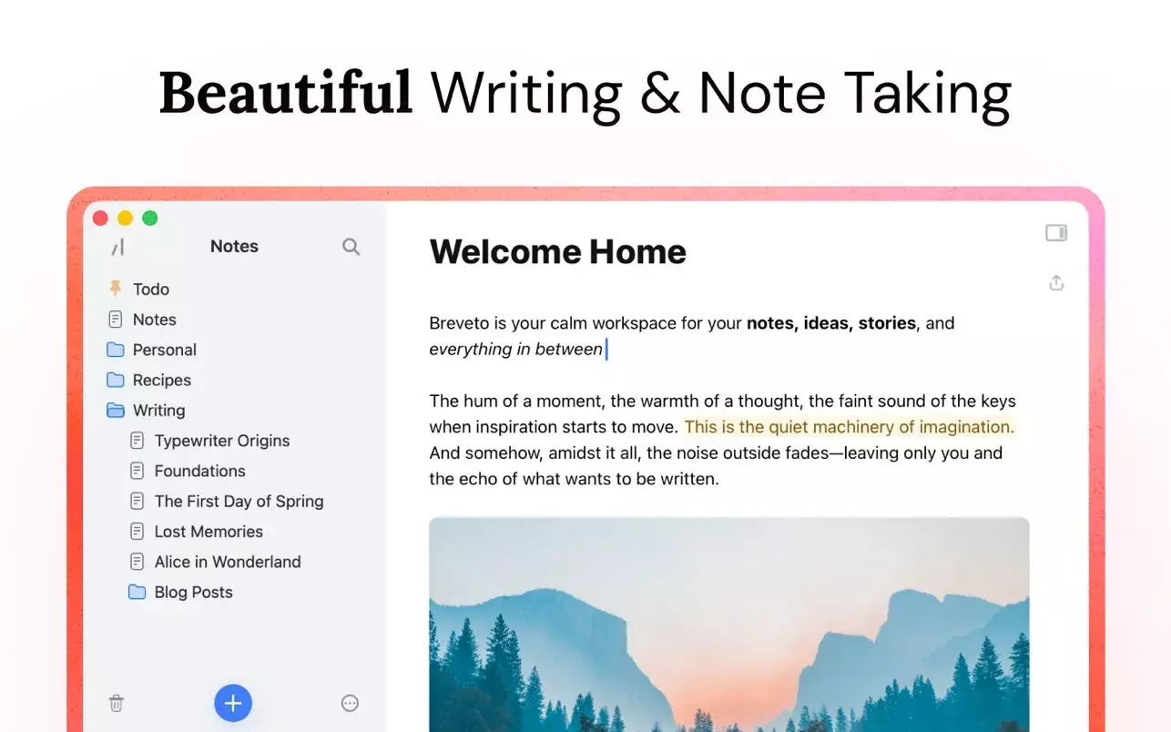 Breveto 是一款美观、简约的写作应用,旨在为用户提供一个宁静的工作空间,记录笔记、构思、故事及其他内容。它将强大的功能与优雅的设计结合在一起,帮助用户轻松组织生活。