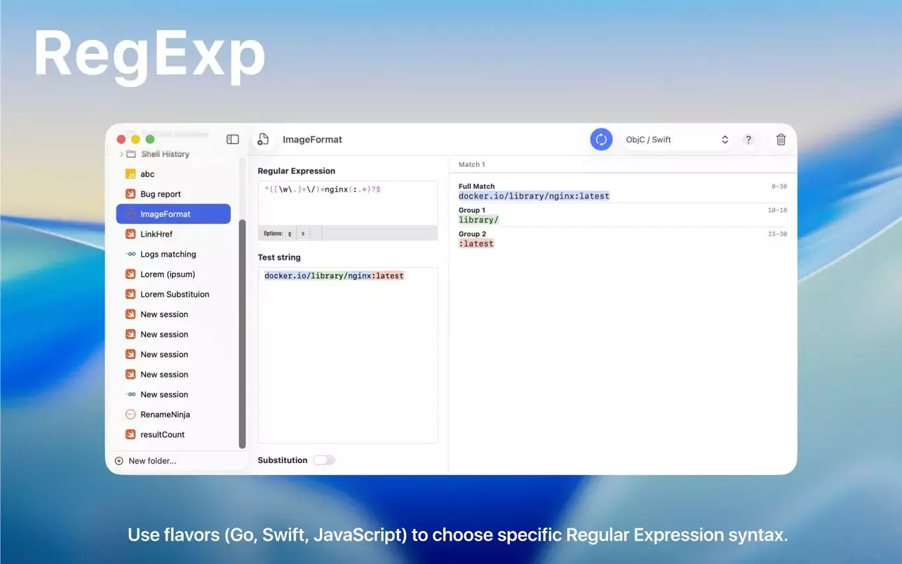 - 多种正则引擎支持: 支持 Swift(完全可配置)、Objective-C、ECMAScript(JavaScript)、Go(仅限 macOS)、Go(POSIX)等多种引擎和语法变体。