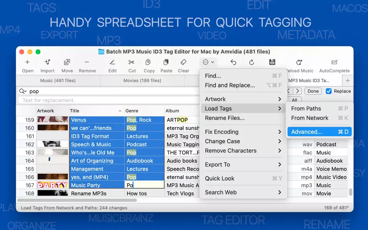 - 批量编辑: 支持编辑、复制粘贴、查找替换170多种音频和视频标签,一次性处理多个文件。