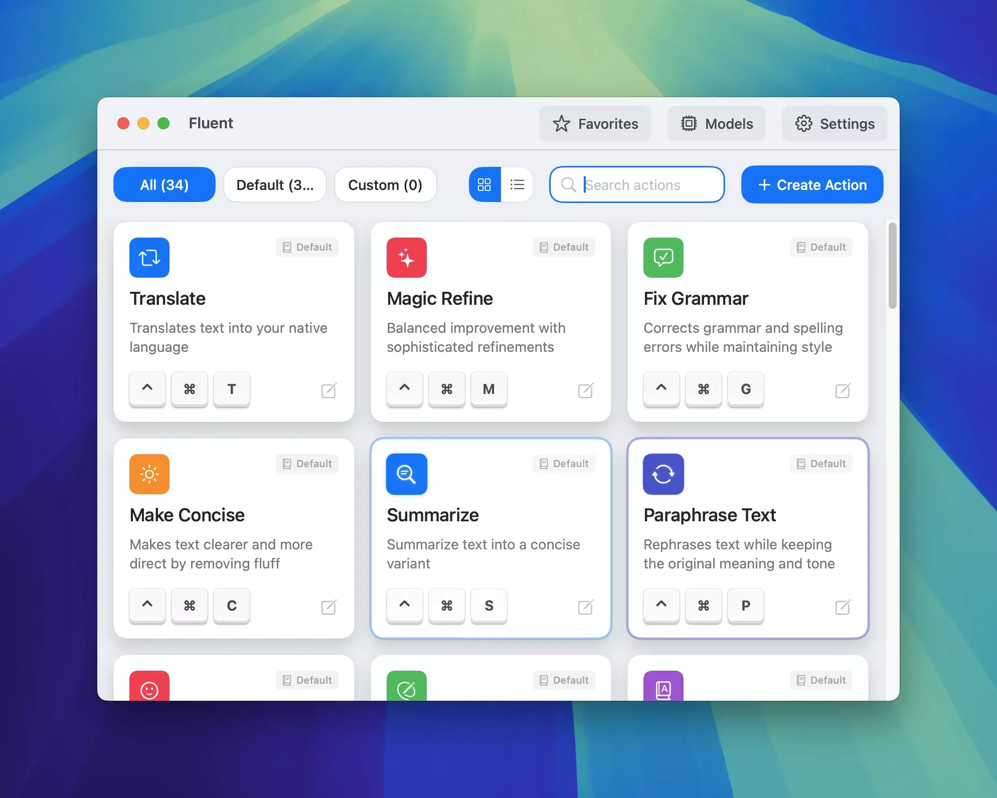 - 自定义快捷键和动作: 在解锁版本中,用户可以创建和分配自定义快捷键,使用无限数量的自定义动作,包含30多种预设默认动作,如翻译、修正语法、草拟电子邮件和社交媒体帖子等。