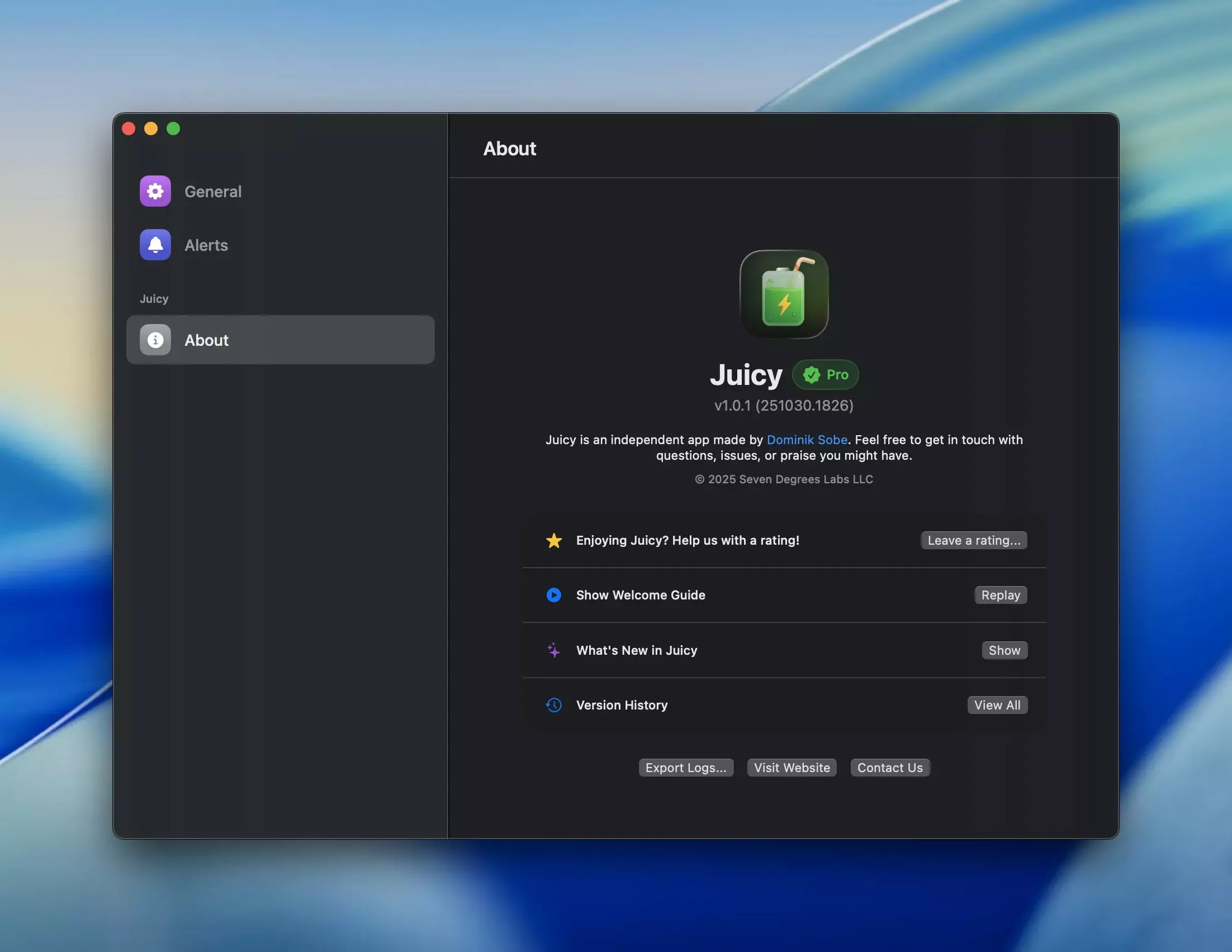 开始使用 Juicy,体验智能提醒、健康洞察以及美丽的设计,确保您的 Mac 电池永不疲惫。