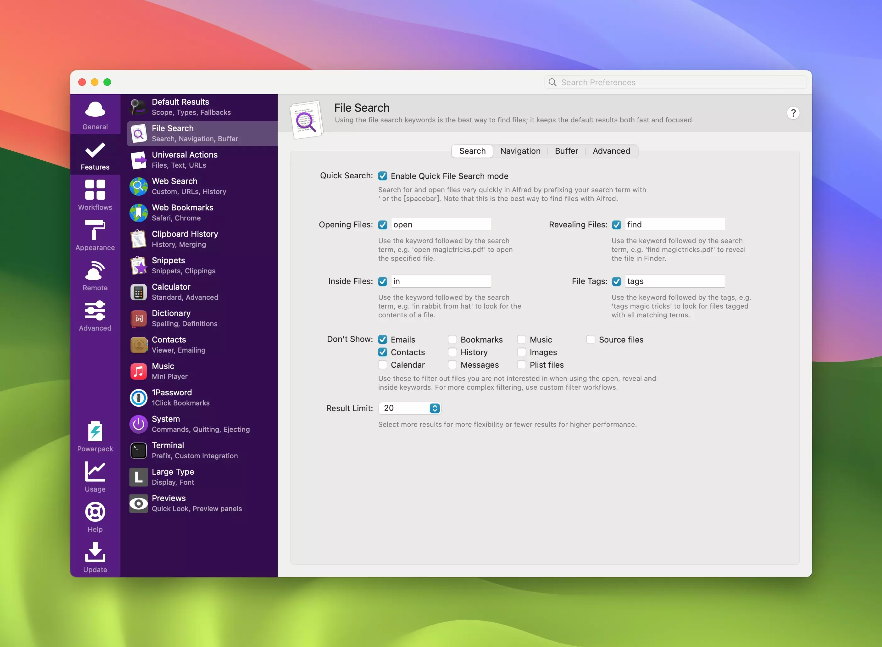 - 提升搜索力量:通过可定制的文件类型和位置筛选器,扩展 Alfred 的核心搜索功能,快速访问所需内容。