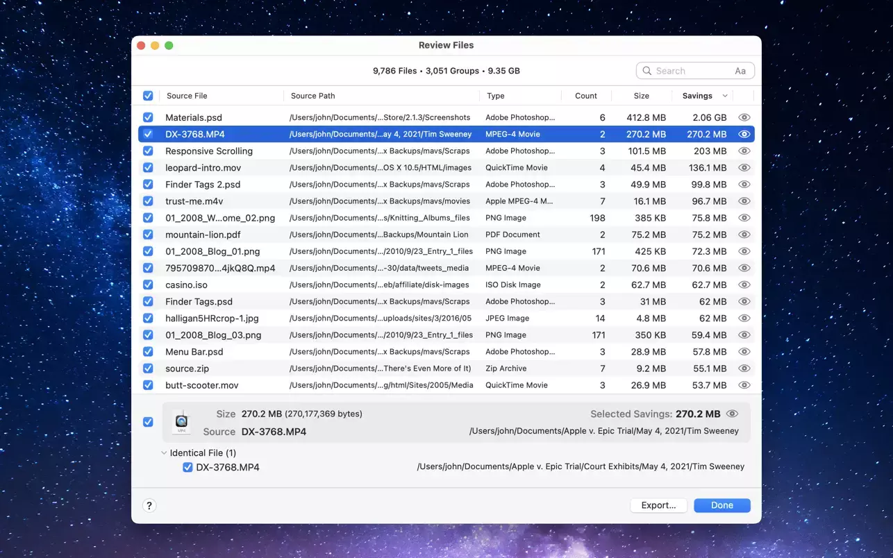 Hyperspace 是一款旨在帮助用户回收磁盘空间的工具,它通过搜索一个或多个文件夹中内容相同的文件,并在找到后仅保留一份,从而回收其余相同文件占用的磁盘空间,而不损坏任何文件。这个过程利用了 macOS 文件系统的标准功能:节省空间的克隆。