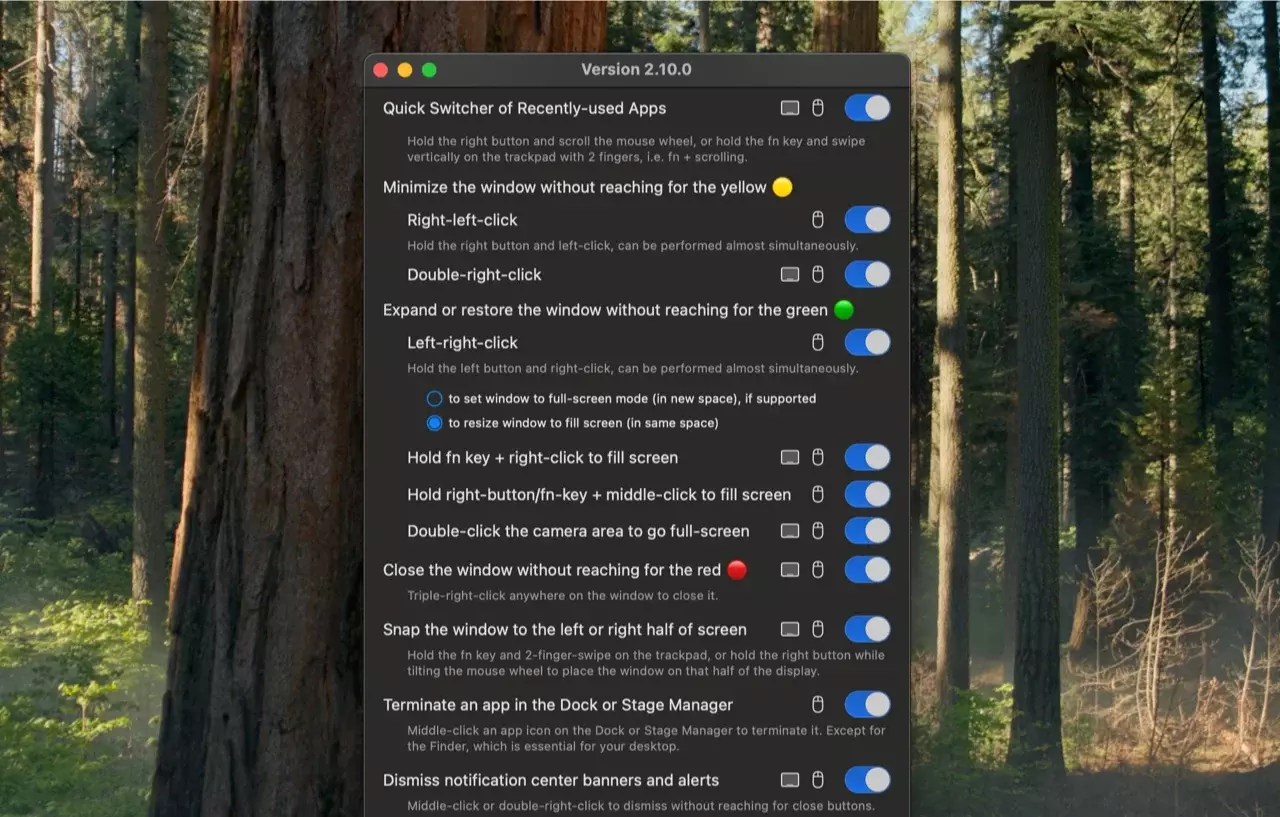 - 更多功能: 中键关闭应用程序,用第三方替代应用程序替换 Finder 点击,将窗口移动到下一个屏幕等等。