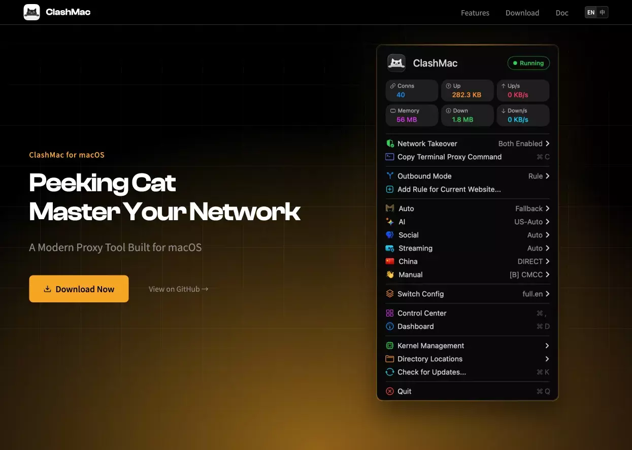 ClashMac是一款轻量级的macOS菜单栏客户端,采用SwiftUI开发,旨在高效与系统无缝集成。它提供了便捷的网络接管功能,支持一键开启和关闭系统代理以及增强模式。ClashMac还具备实时流量监控、流量统计和连接数等可视化面板,用户可以通过Web控制面板进行管理,同时应用内更新功能能够自动检测和安装新版本。用户可以在Releases页面下载适用于Apple Silicon或Intel Mac的最新版本,安装过程简单。需要注意的是,由于该应用未经过Apple公证,可能会遇到安全警告,用户可根据提供的解决方法解除限制。ClashMac使用了多个第三方开源组件,相关许可证列表可在项目页面查看。
