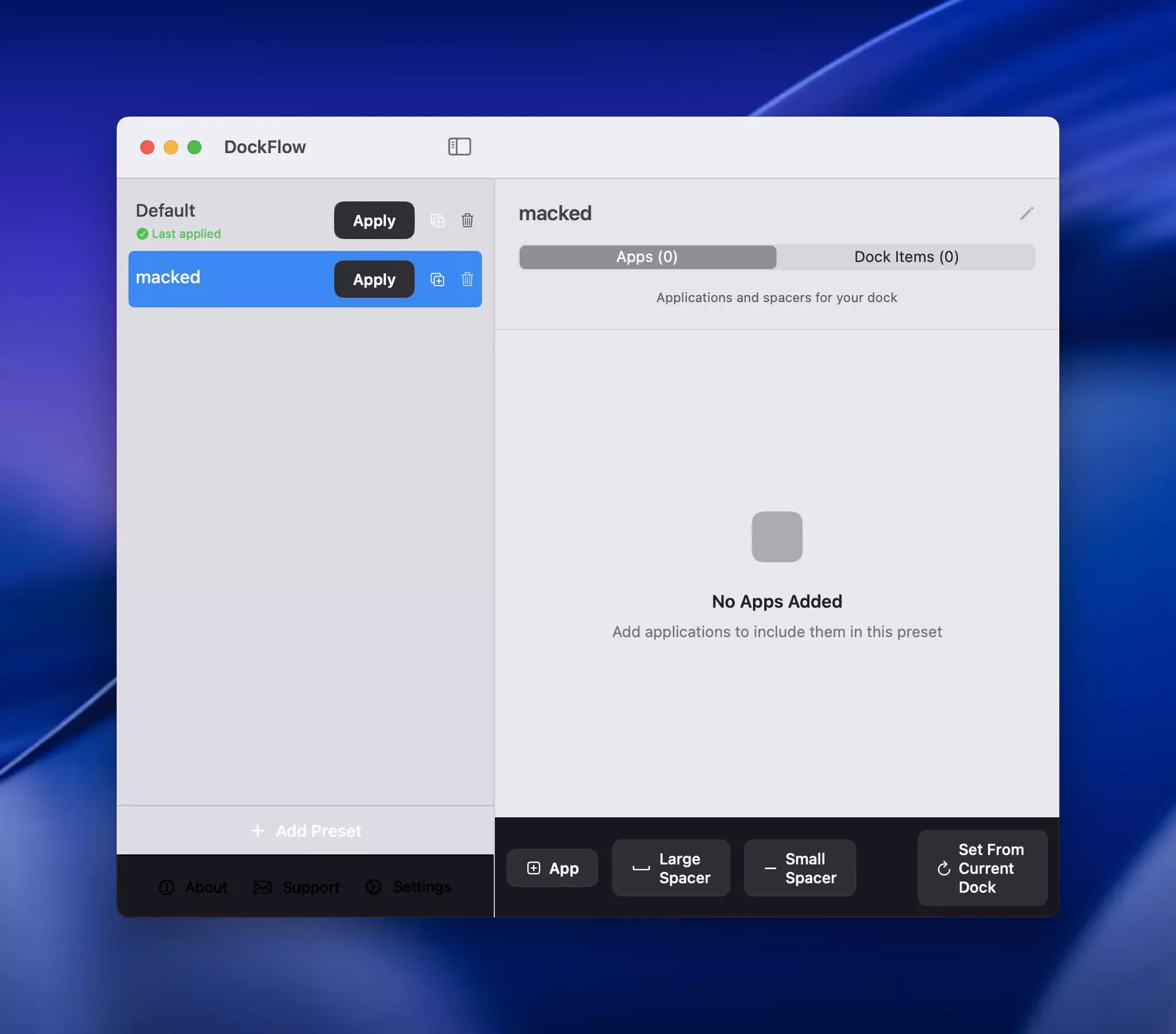 - 添加图标间隔: 支持在图标之间添加大/小宽度的空白间隔,帮助用户自由布局,使 Dock 更加整洁合理。
