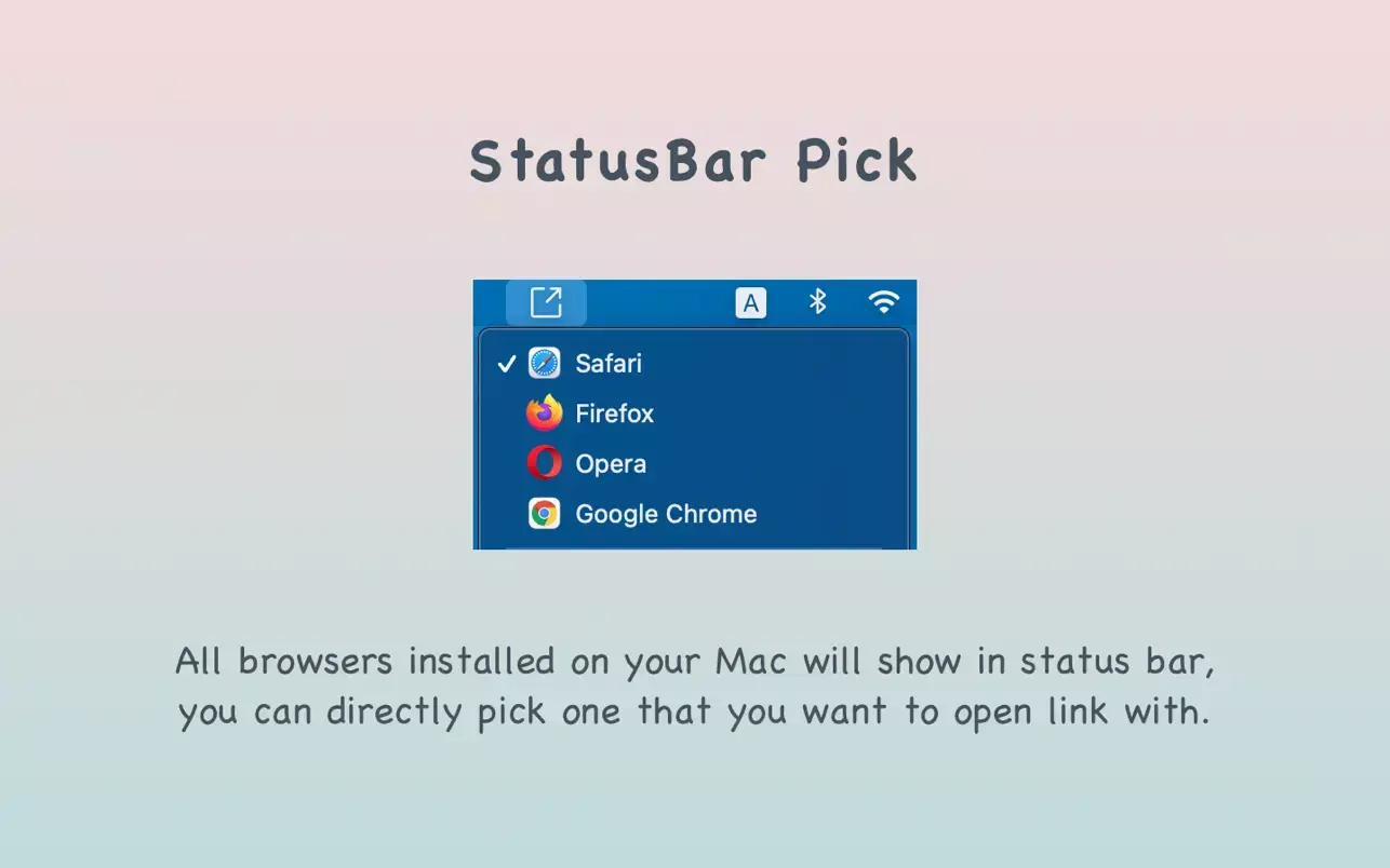 - 灵活浏览器选择:点击链接时可快速弹出菜单,选择 Safari、Chrome、Firefox、Opera 等已安装浏览器,或任何支持打开 URL 的应用,实现一键切换。