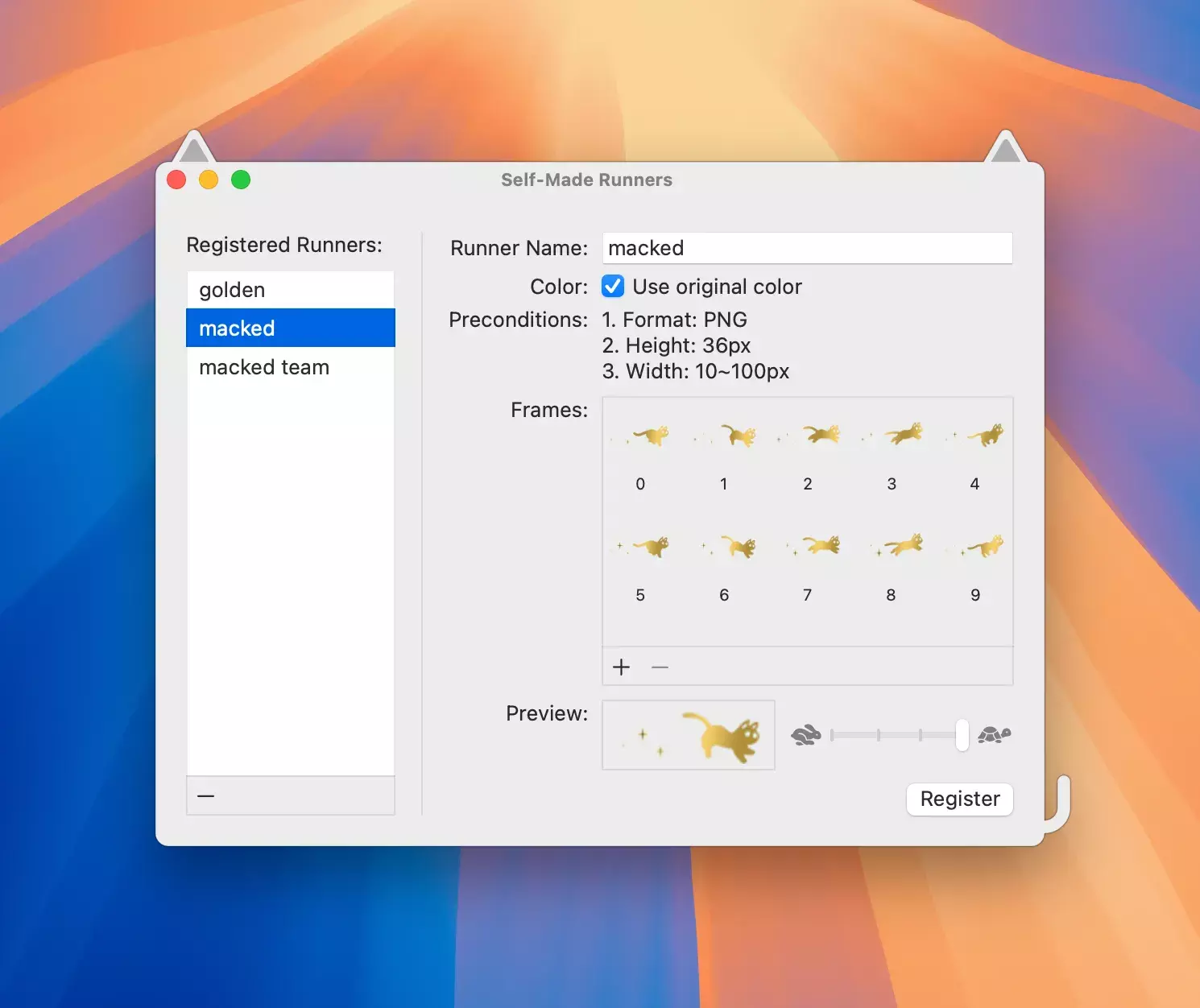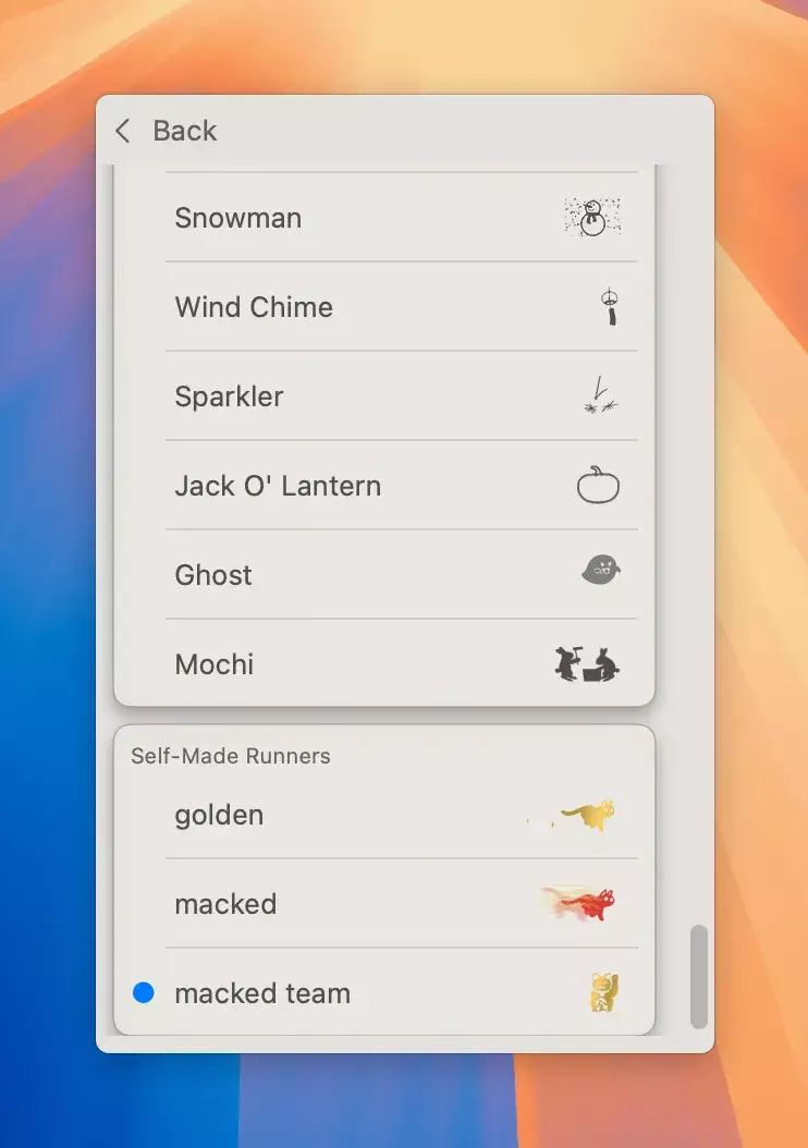 RunCat是一款有趣的菜单栏应用,它在你的Mac菜单栏中安置了一只可爱的猫咪,猫咪的奔跑速度与CPU使用率相关联。用户可以通过观察猫咪的奔跑状态,轻松了解当前的CPU使用情况,特别是在等待视频导出或程序构建等任务时,增添几分乐趣。应用内提供多种类型的跑者可供购买,包括七种特殊颜色的猫咪(如金色猫、金属猫等),28种动物类型的跑者(如猎豹、狗、兔子等),15种无生命物体类型的跑者(如齿轮、火焰、火箭等),以及七种季节性跑者(如圣诞驯鹿、万圣节南瓜等)。RunCat还可以监控CPU使用率、内存性能、存储容量、电池状态和网络连接。用户还可以注册自己制作的跑者(通过应用内购买)。请注意,开发者可能会在没有通知的情况下停止对旧版macOS的支持。
