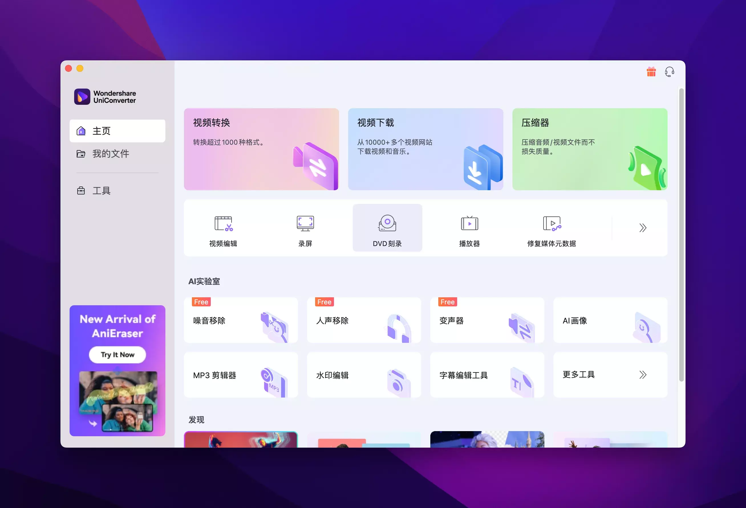 Wondershare UniConverter 还提供了一些 DVD 工具,用户可以使用这些工具来处理 DVD 文件和光盘。用户可以使用这些工具复制 DVD 光盘、转换 DVD 视频、刻录 DVD 光盘和 ISO 文件等等。此外,Wondershare UniConverter 还提供了一个 DVD 制作工具,用户可以使用该工具将自己的视频转换成 DVD 格式,并将其刻录到 DVD 光盘上。
